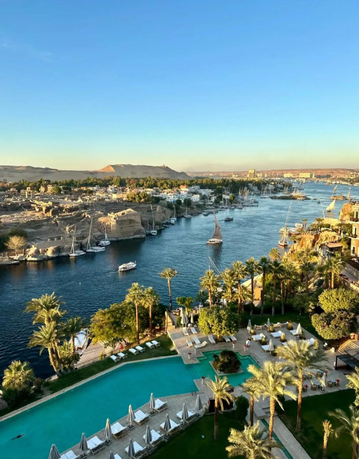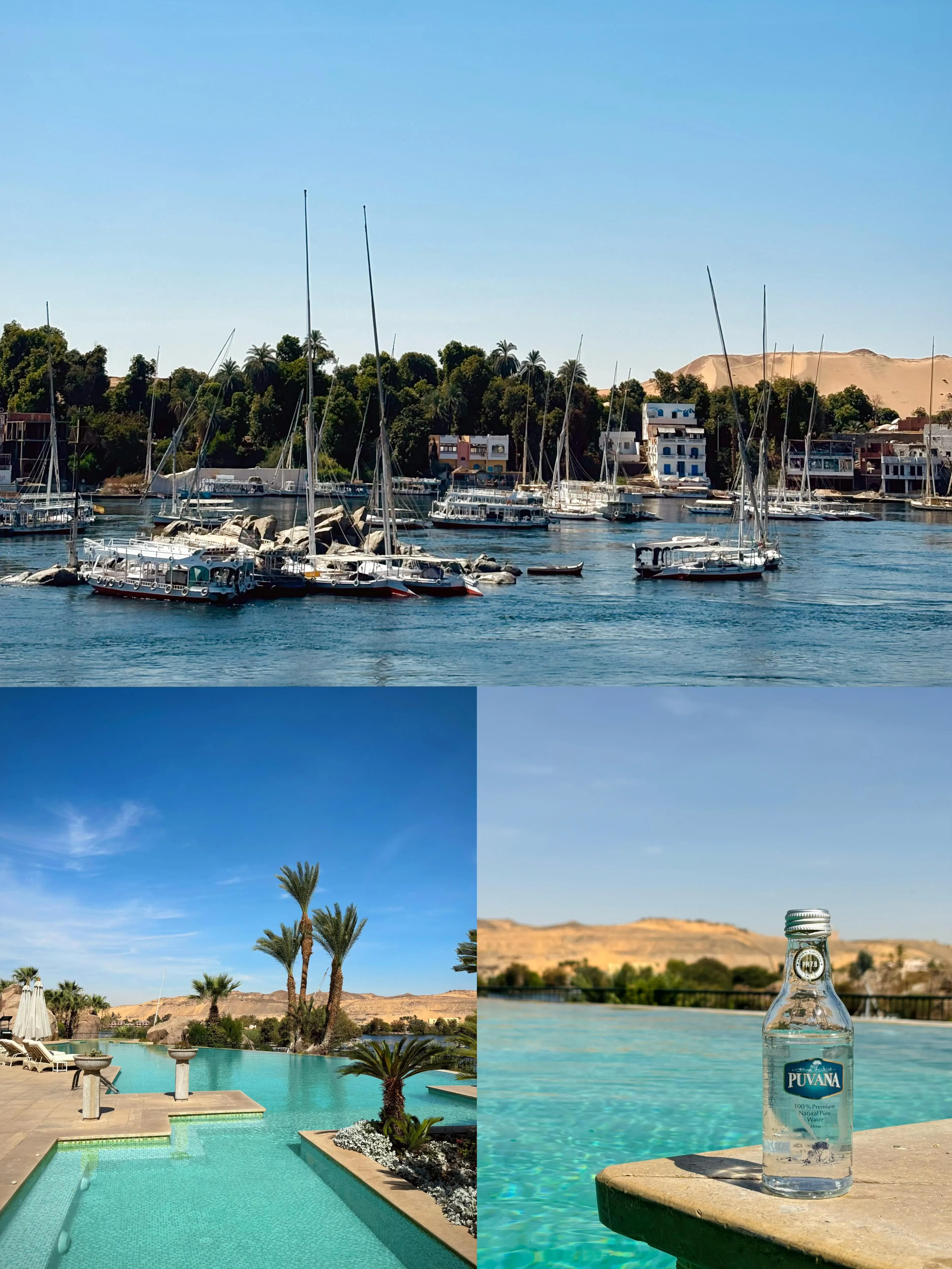 第三天飞往阿斯旺。相比开罗,这里更加整洁。我们入住了老瀑布酒店,体验了老楼和新楼。老楼内部复古,更有韵味;新楼视野更佳,能拍到尼罗河最美的景色。 我们选择在酒店放松,享受游泳和按摩 ,只在附近的当地餐厅用餐。