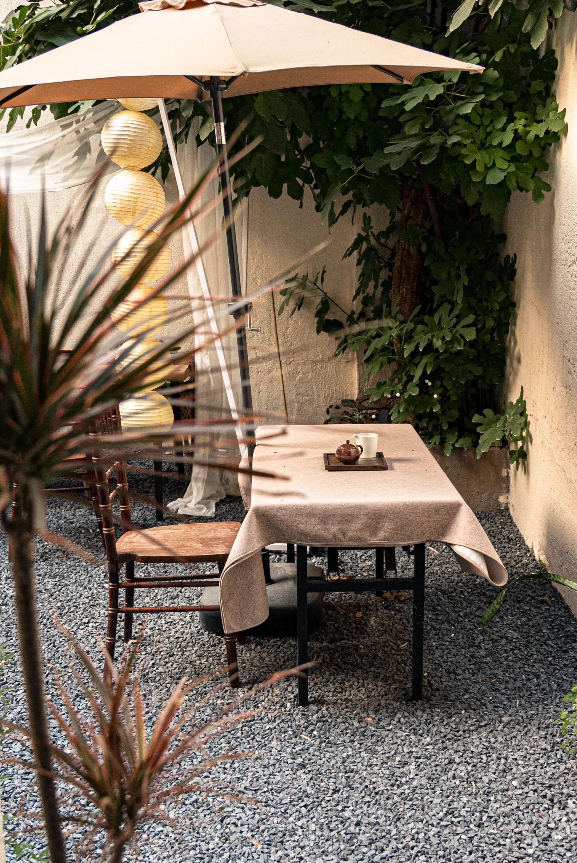 茶馆环境优雅,常有焚香抄经、做漆扇等文化活动,还会定期举办茶香会。小院里种植了无花果树和薄荷,秋季时可以直接摘取成熟的果子。薄荷叶配柠檬泡水,清凉解暑的效果很好。