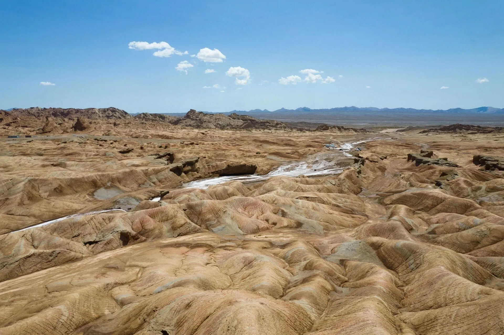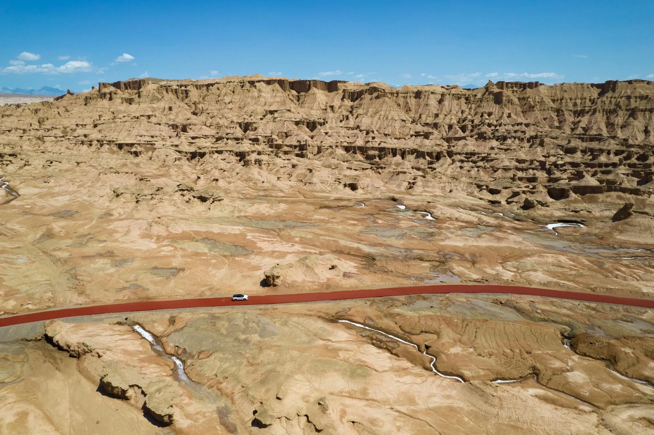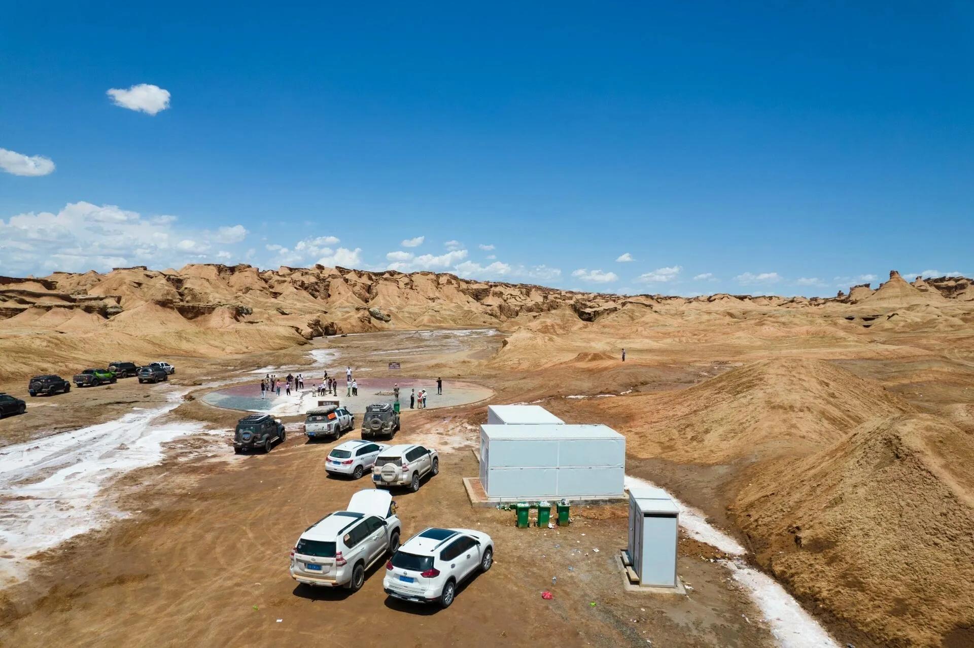 在烈焰泉不远处,我们看到了正在修建的克孜尔魔鬼城。 虽然还未完工,但已经免费开放。这里最引人注目的是山上的自然景观,乍一看竟然酷似一座座建筑遗址,甚至比米兰遗址更像真的古城遗迹。