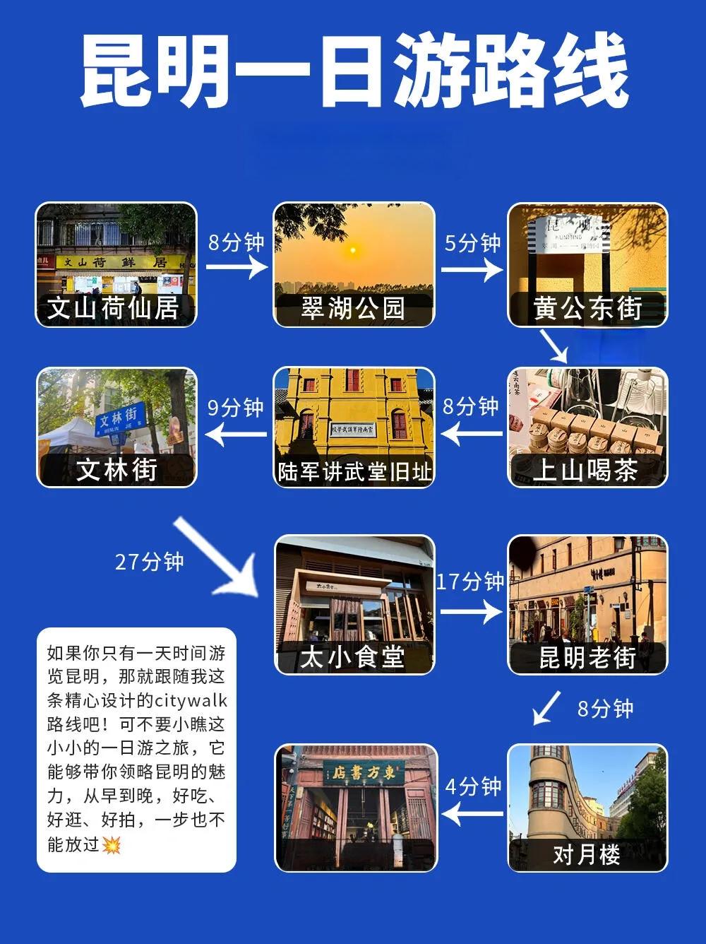 昆明,这座常被低估的城市,其实藏着无数惊喜。 如果你只有一天时间游览昆明,不妨跟随这条精心设计的citywalk路线, 从早到晚,好吃、好逛、好拍,领略昆明的魅力。