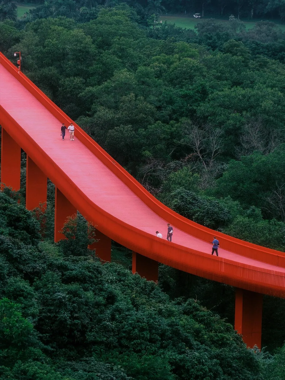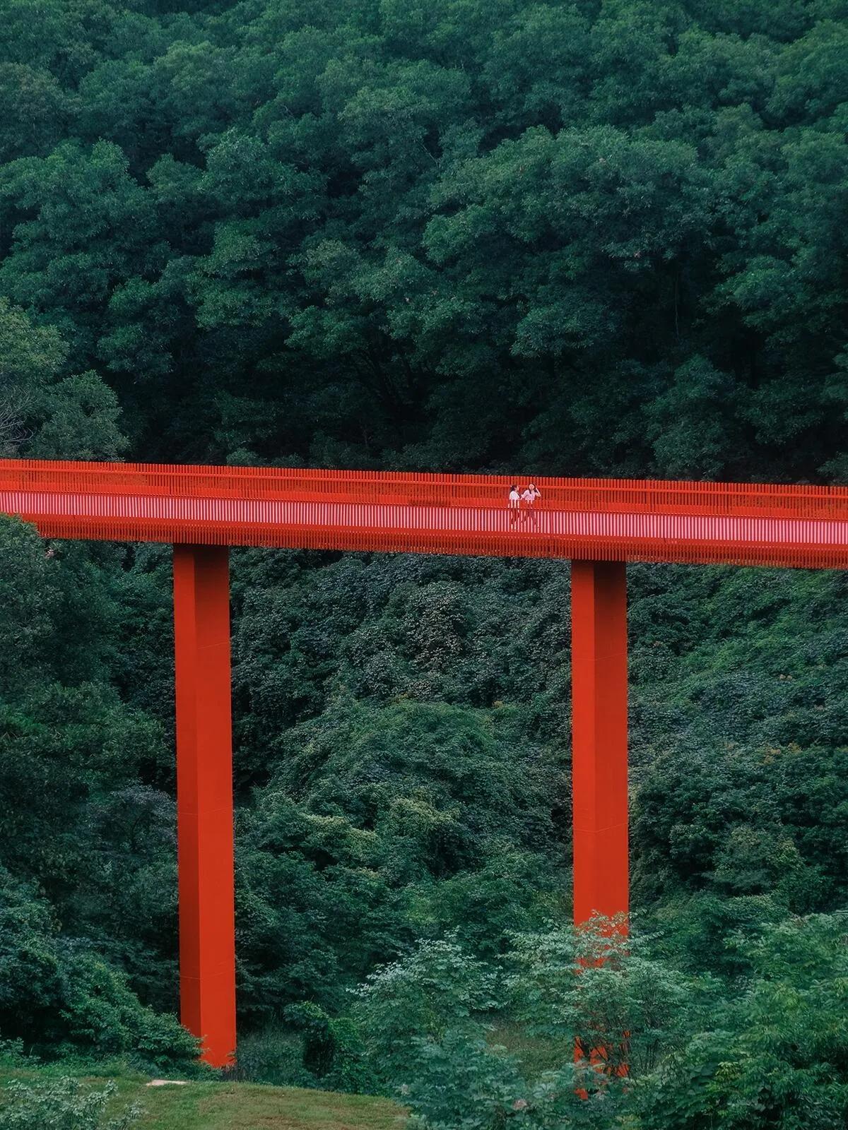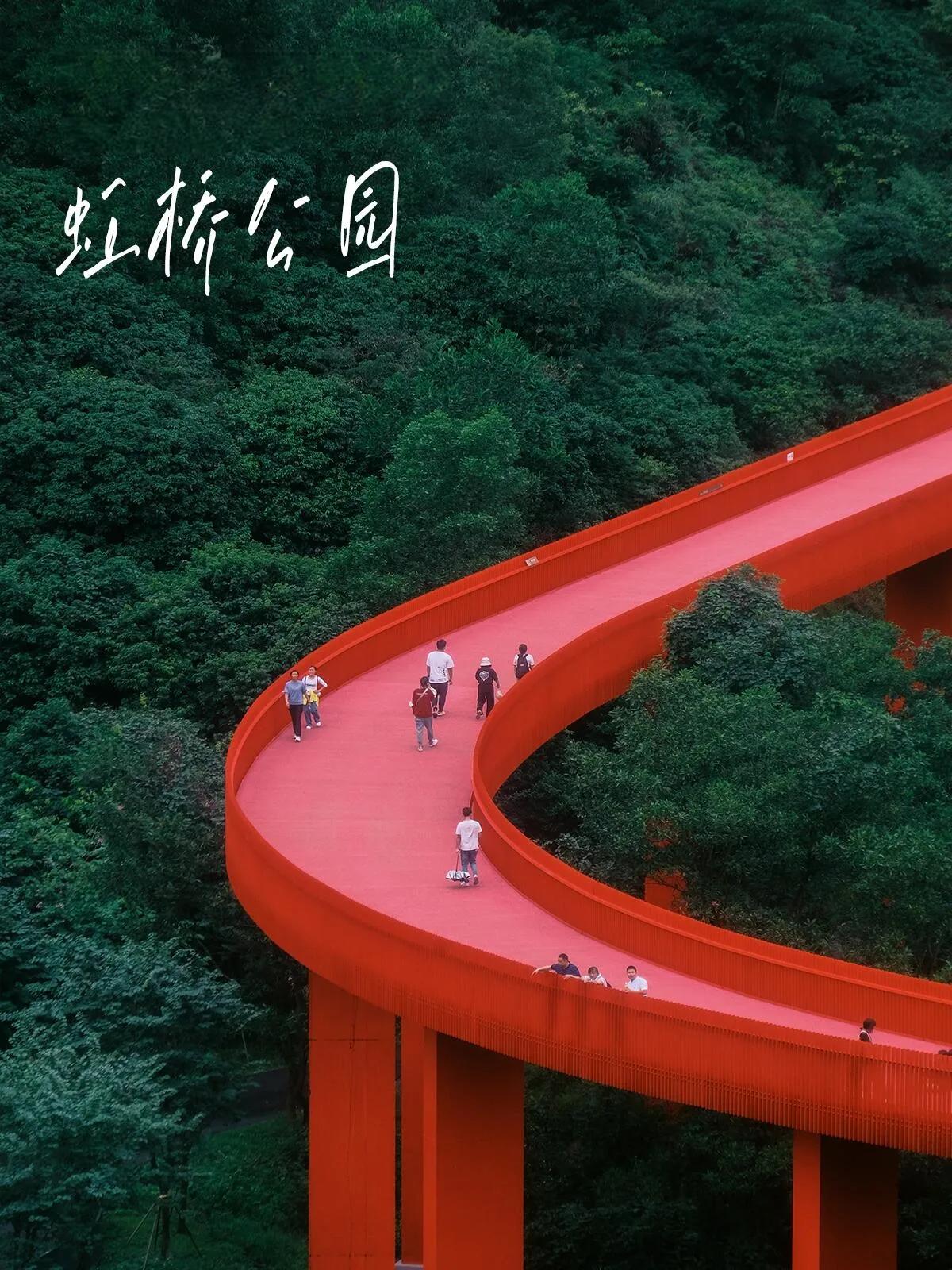 虹桥公园是一个多功能的户外休闲场所,适合轻松徒步、户外露营、野餐和拍摄等活动。公园的核心景观——虹桥,整体采用了中国红作为主色调,缠绕在青山绿水间,宛如仙女腰间的红色腰带,让人耳目一新。这座桥全长4千米,宽5米,平均高度8米,是中国国内第二大钢结构单柱多曲景观桥。