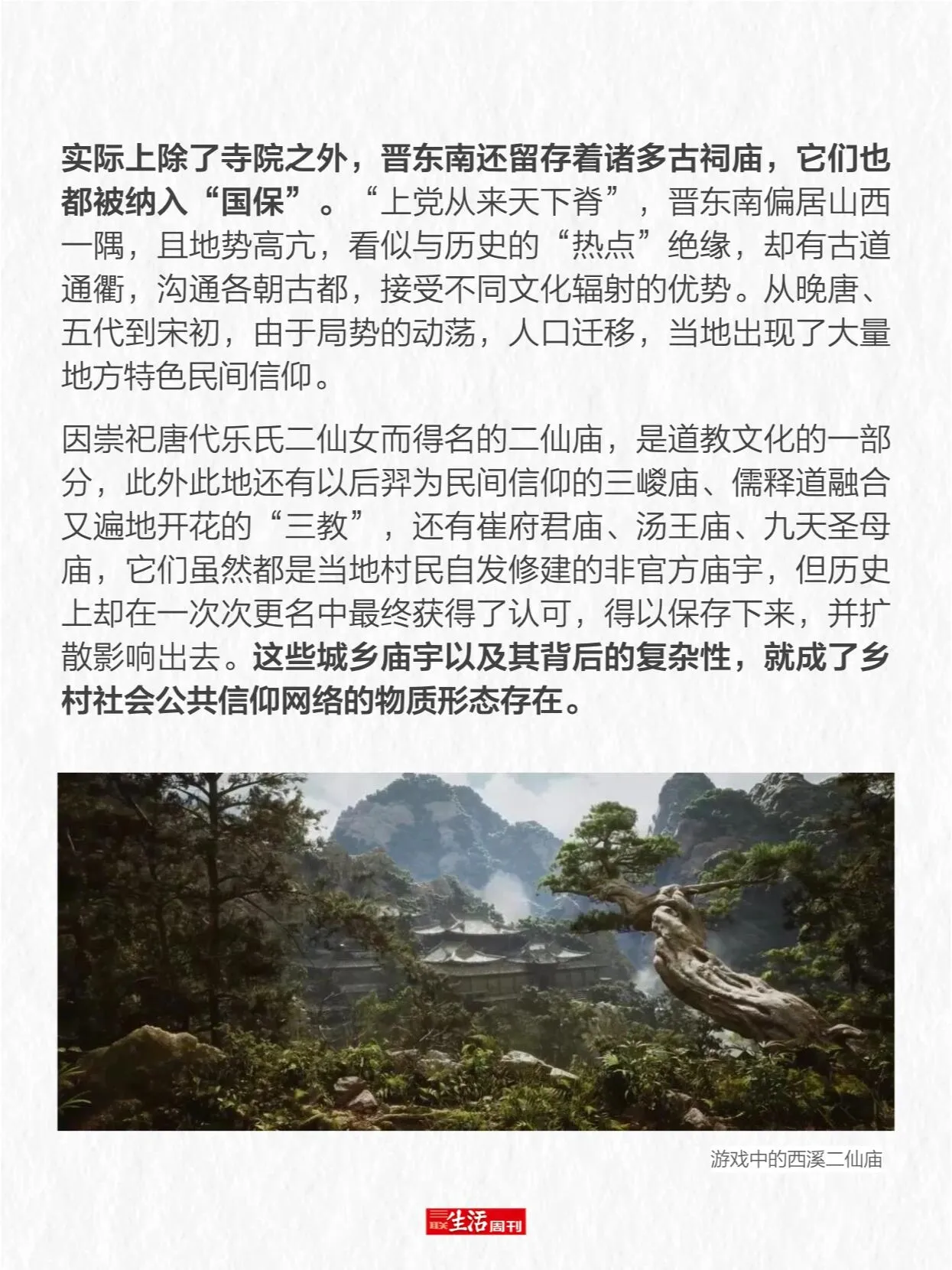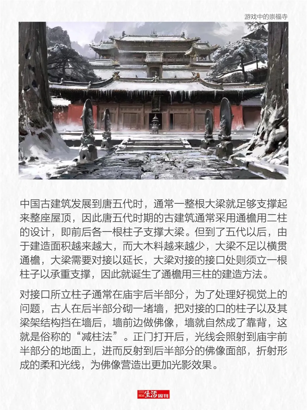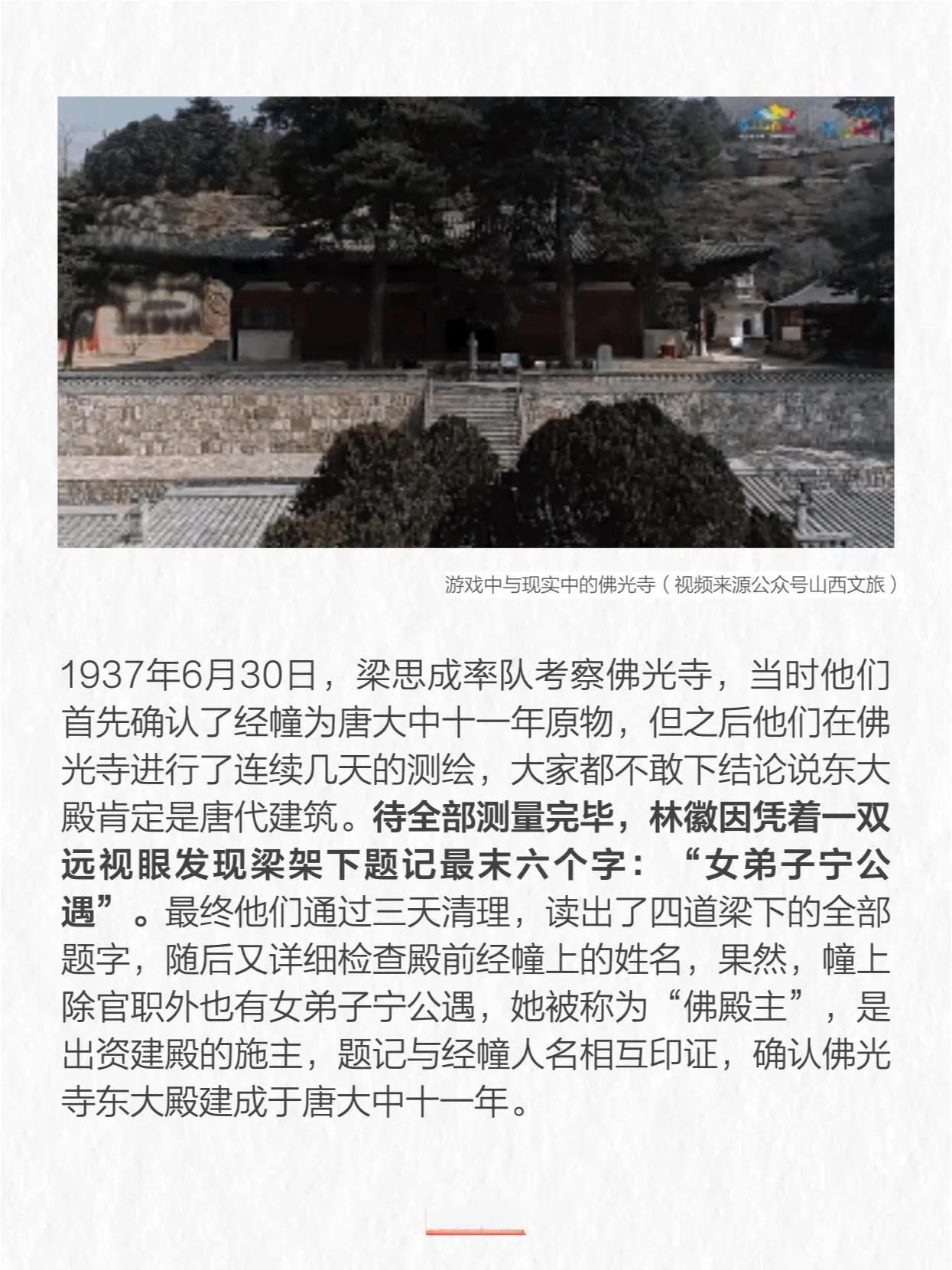 从建筑艺术角度来看,按照梁思成在《中国建筑史》中的说法,中国古建筑的“柱梁构架在唐宋金元为富有机能者”,到了明清则为“单调少趣之组合”。这也解释了为何游戏中更多选用元以前的古建筑作为灵感来源。
