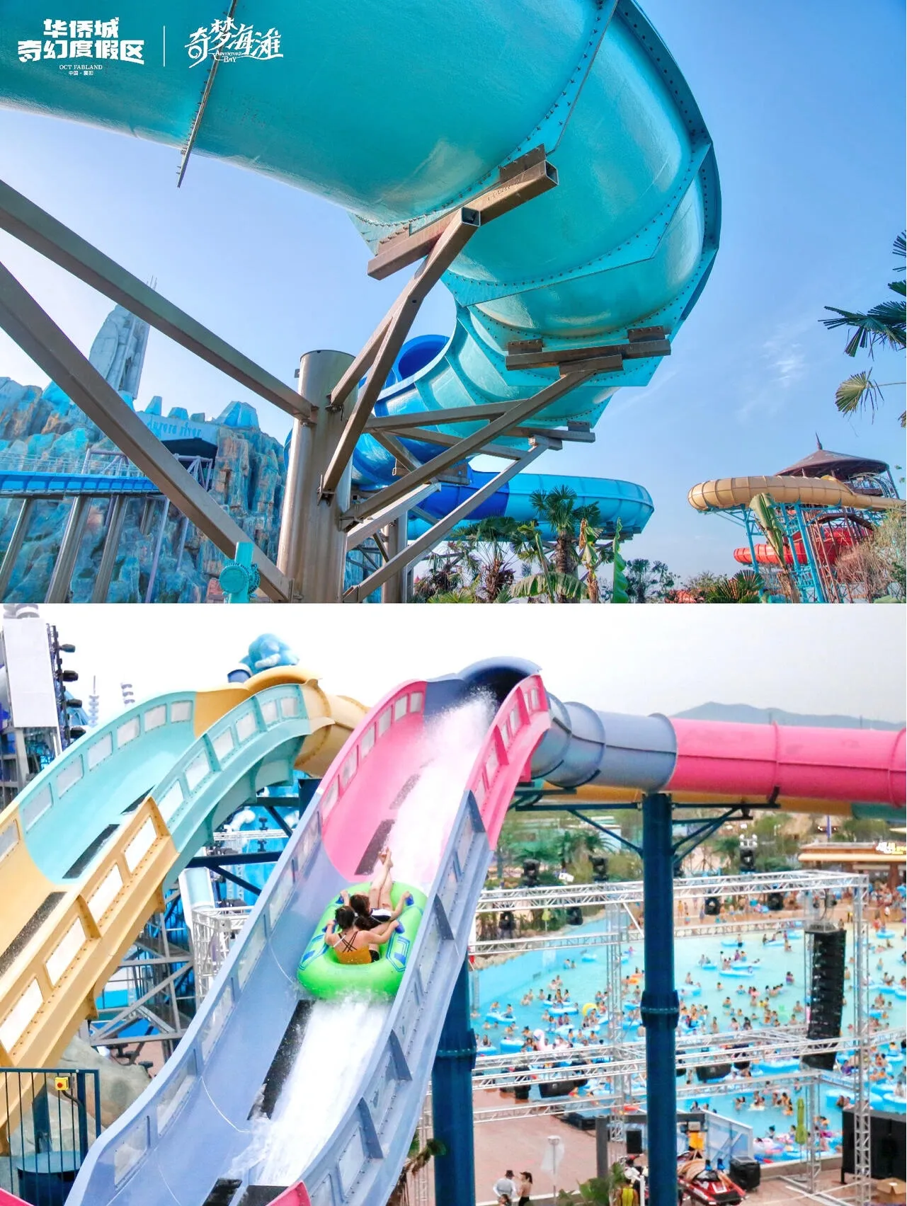 “鲲鹏风暴”则是大浪板和大喇叭的完美结合。从11米高的塔顶乘坐浮筏顺势而下,体验漩涡般的极速回旋,刺激程度让人忍不住想再来一次。