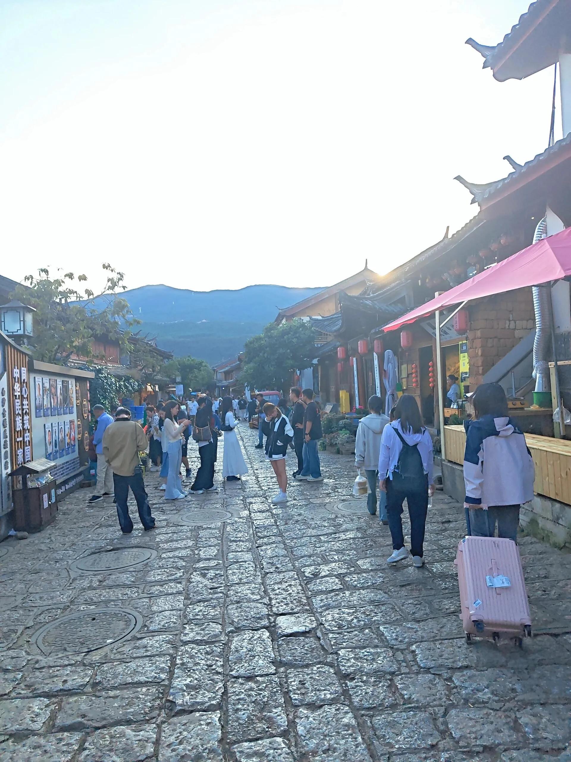 束河古镇入口处有人兜售骑马服务,但实际体验并不理想,仅是在街道上牵马而行。相较之下,内蒙古的草原骑马体验更为authentic。束河古镇规模较小,20分钟即可游览完毕。街道上人流稀少,商家也不似大理丽江古城那般热情。值得注意的是,街道上马粪气味较重,美食选择有限,整体来说不太推荐前往。