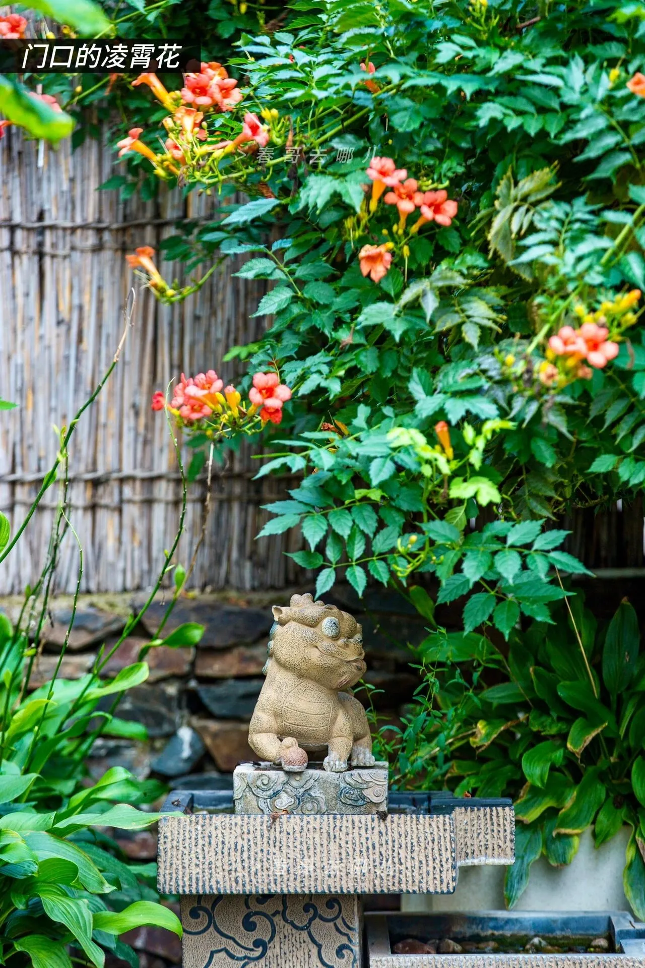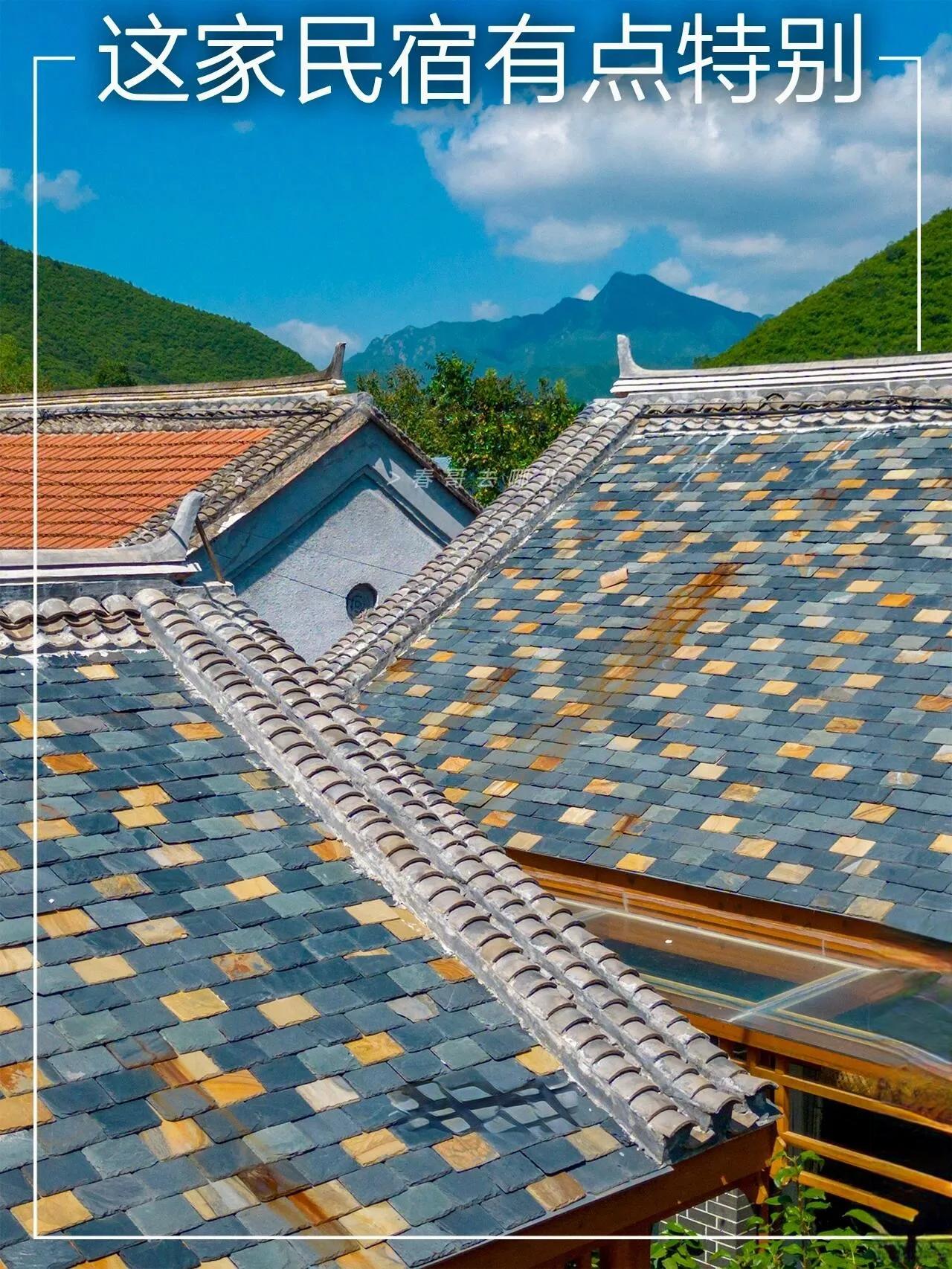 庭院里种植了桂花树和八棱海棠 ,中秋时节桂花飘香,海棠挂满红果,景致宜人。屋顶上青灰与橙黄相间的石板瓦更是引人注目,既古朴又富有质感。这种石板瓦在法国古建筑中常见,也是九渡河一带传统建筑的特色。民宿老板作为本村人和懂建筑的地产人,似乎在用这种方式传承和守护古村落的传统。