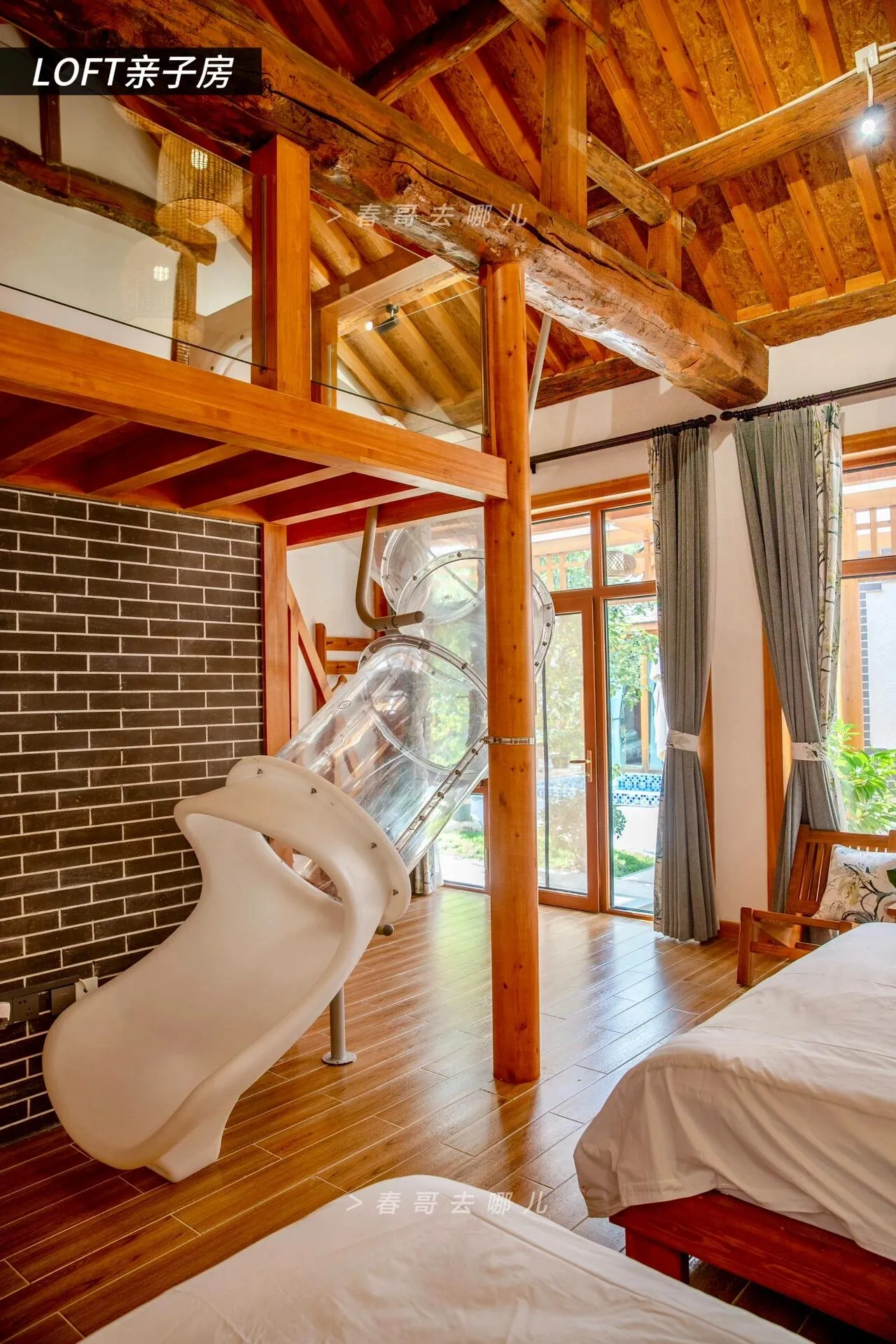 民宿的房间宽敞舒适,床铺宽大。 其中3间是LOFT亲子房,配有透明管状大滑梯和带浴缸的卫生间 ,另有1间是超大榻榻米房。院中的小泳池专为孩子们准备,非常贴心。