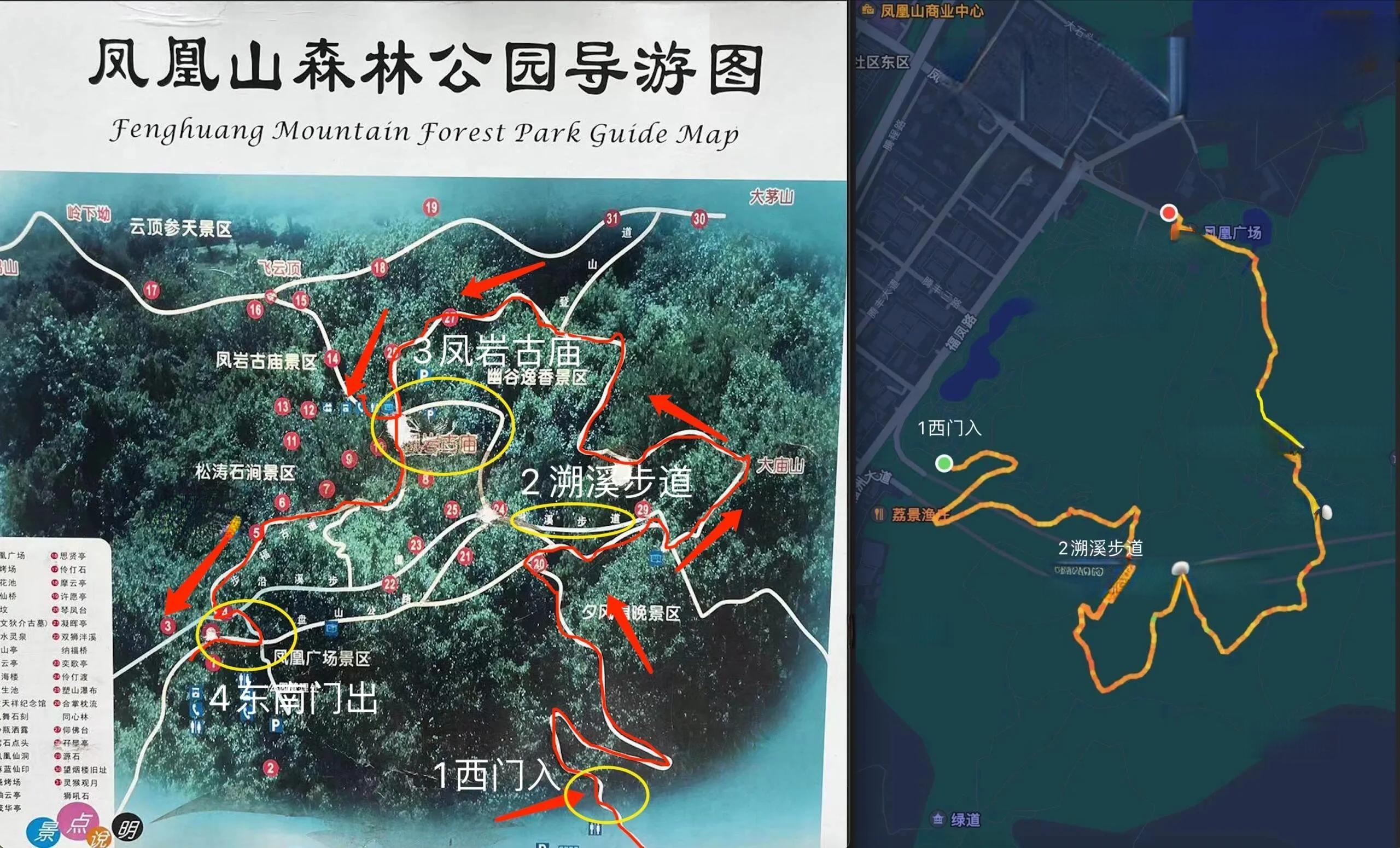 作为第一次去凤凰山公园的游客,我发现 官方导游地图和手机导航地图的方位不一样 ,这让人有些困惑。为了帮助大家更好地理解凤凰山公园的布局, 我特别制作了一个对比图 ,希望能让大家轻松看懂导游图,玩得开心,不走冤枉路!
