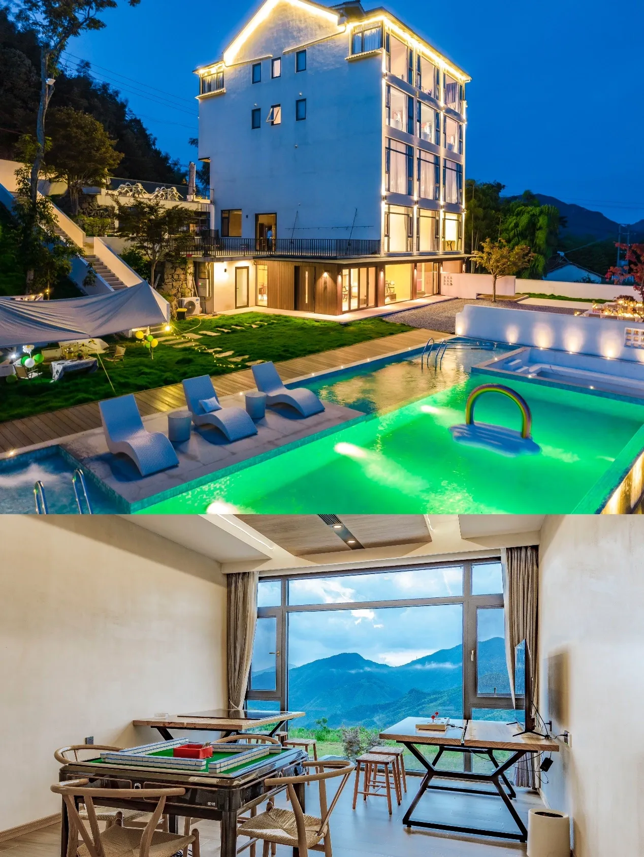 用餐之后,民宿还提供丰富的娱乐活动。室外设有蹦床和观景平台,guests可以观山看海、赏雾盼星辰。泳池区域不仅适合游泳,还提供透明船,让不会游泳的guests也能轻松玩耍。