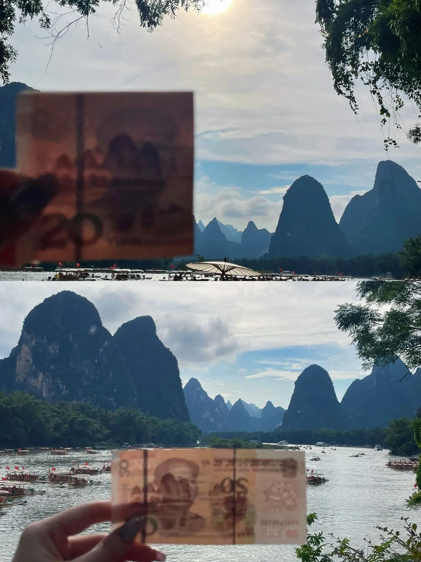 第一天:下午抵达阳朔站,打卡二十元景点。乘坐大巴前往兴坪古镇(5元),车站提供行李寄存服务(5元)和电动车租赁(20元)。晚上乘大巴返回阳朔西街(15元)。