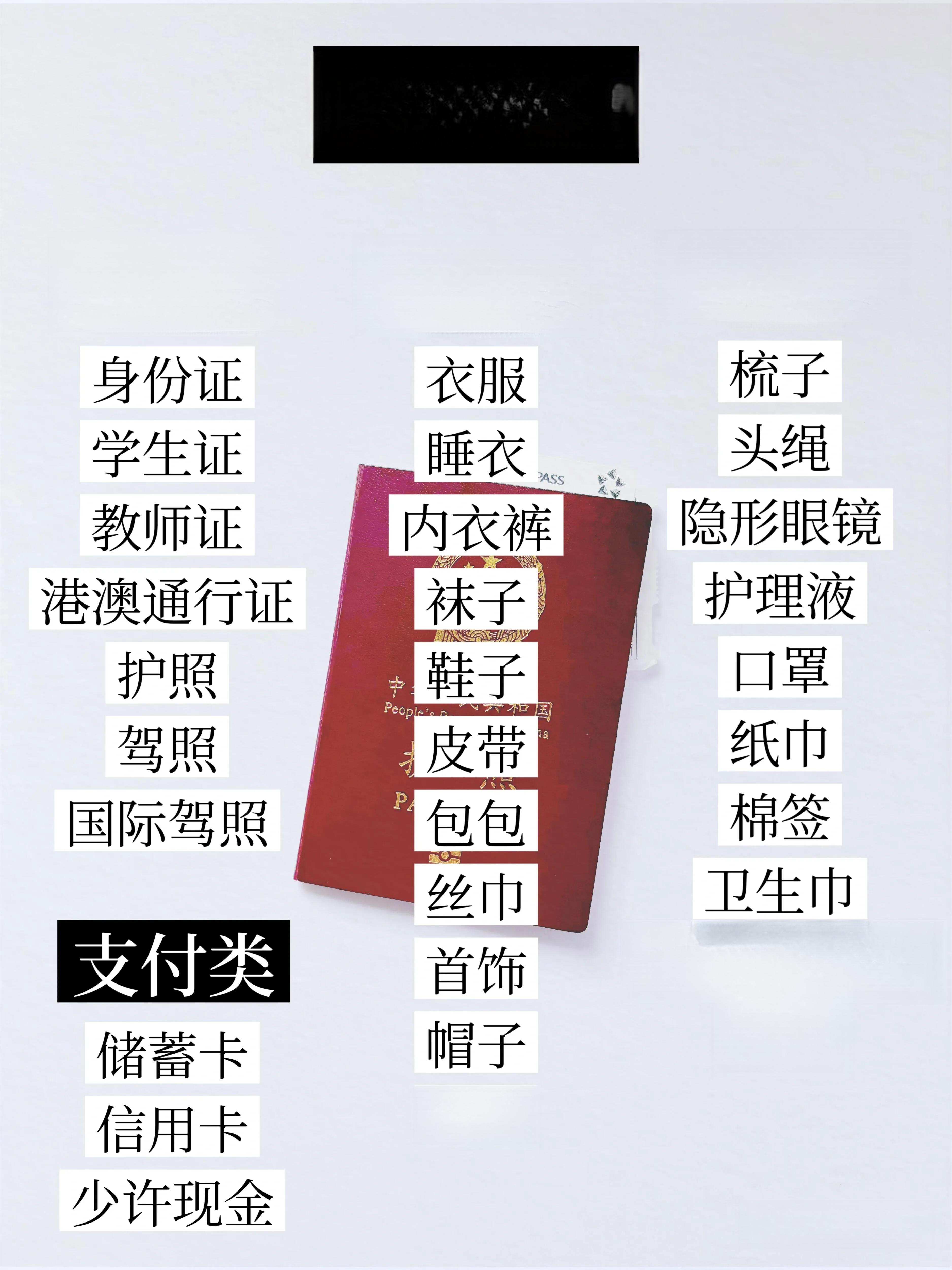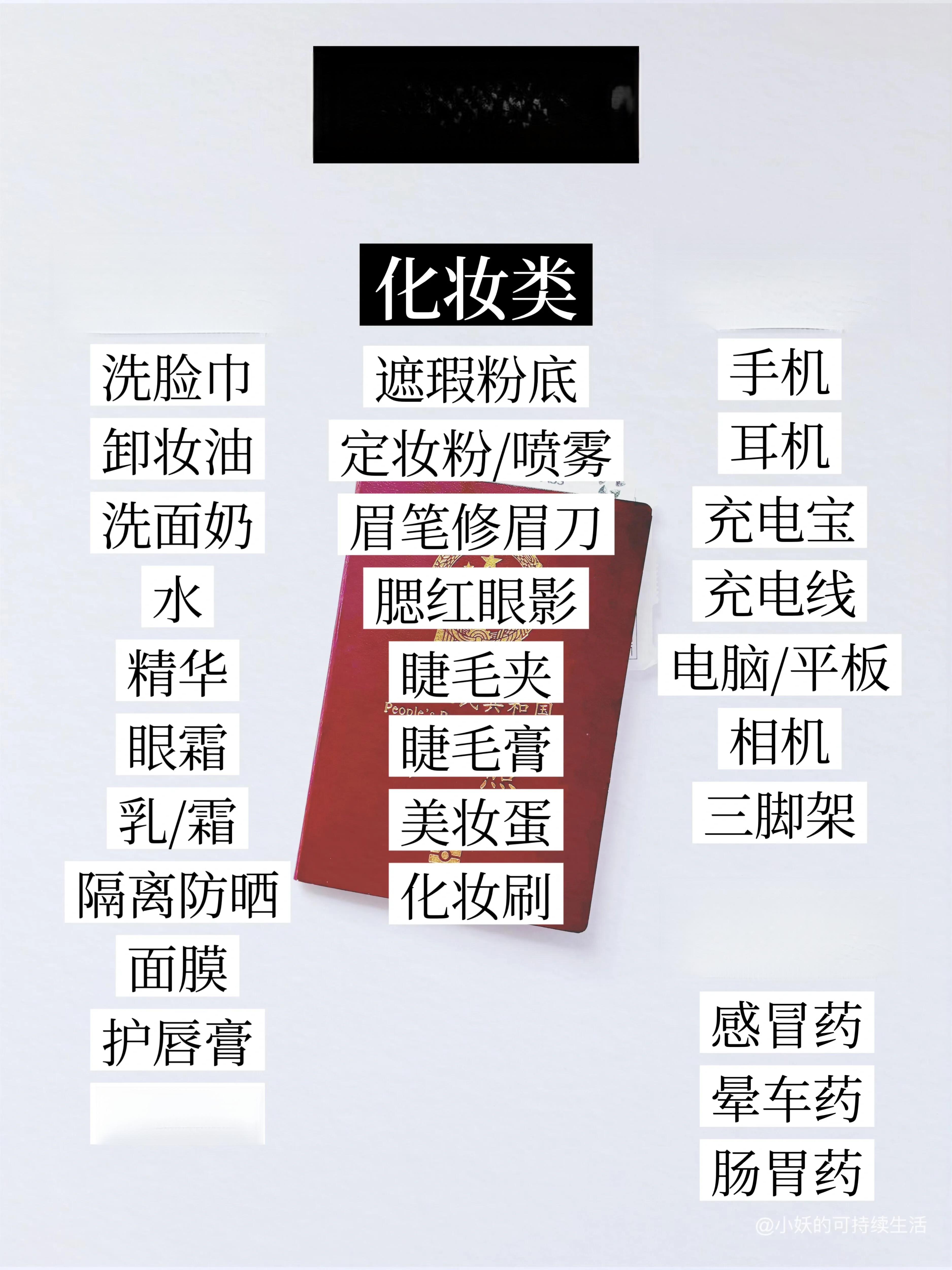 这份清单涵盖了证件类、支付类、衣物类、生活类、护肤类、化妆类和电子类等多个方面,确保你不会遗漏任何重要物品。