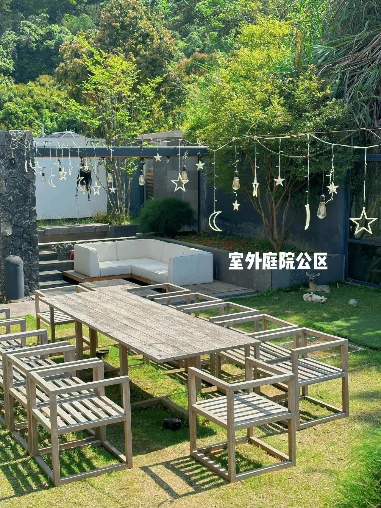 别墅的庭院公共区域是整个度假体验的亮点。宽敞的空间配备齐全的桌椅,非常适合举办聚餐、烧烤或团建活动。左右两侧各有一个室外温泉泡池,在这里泡温泉、品美食,享受惬意时光。