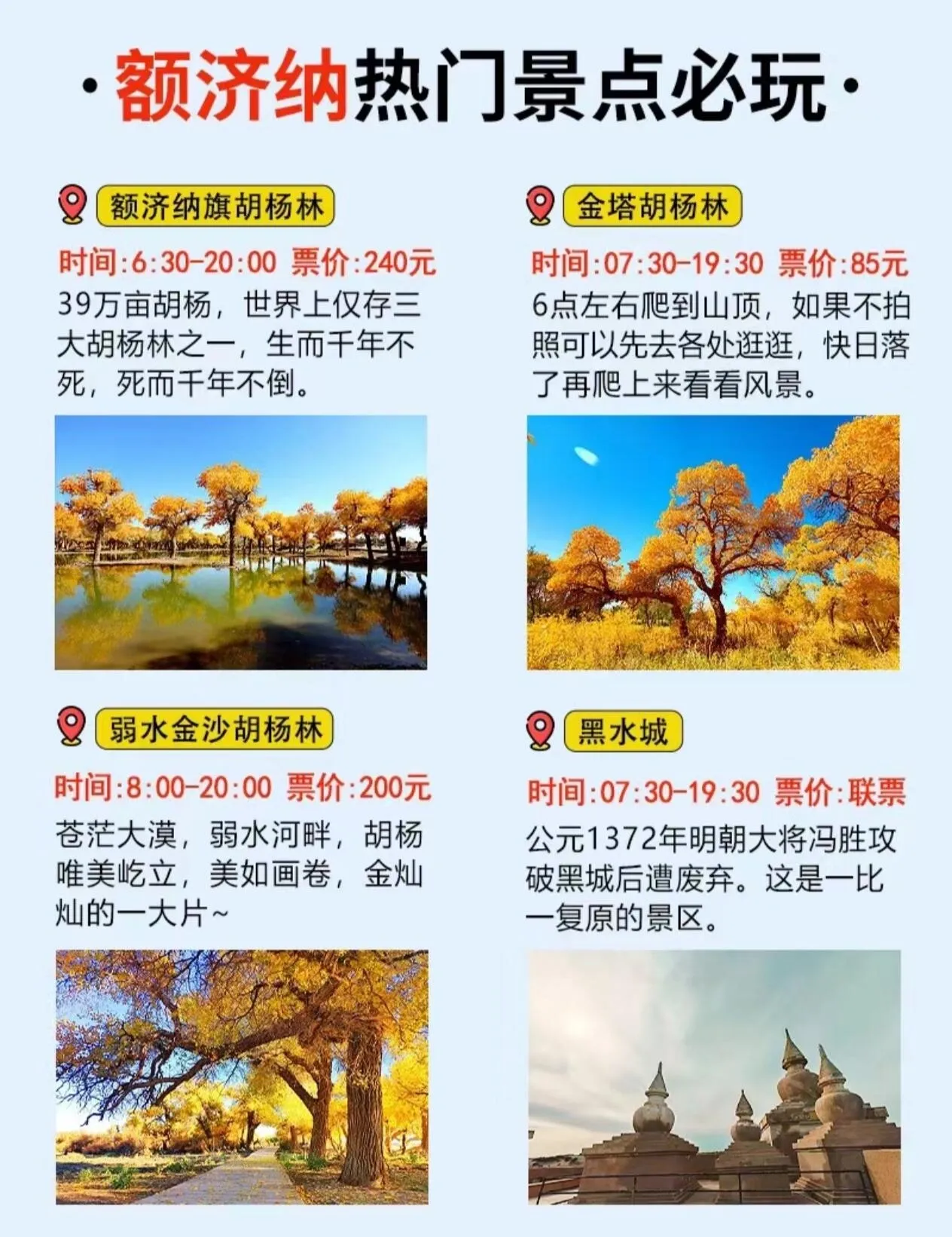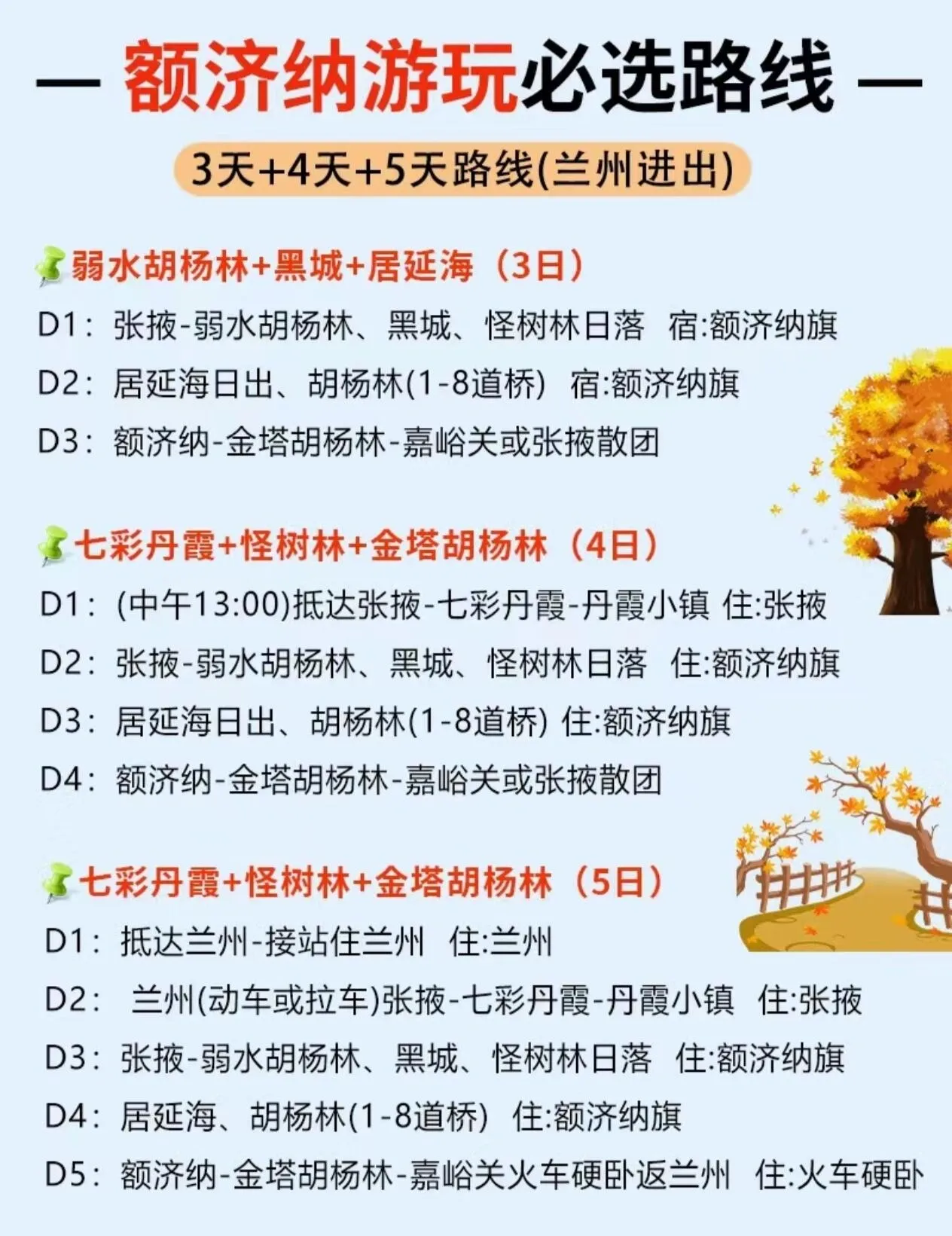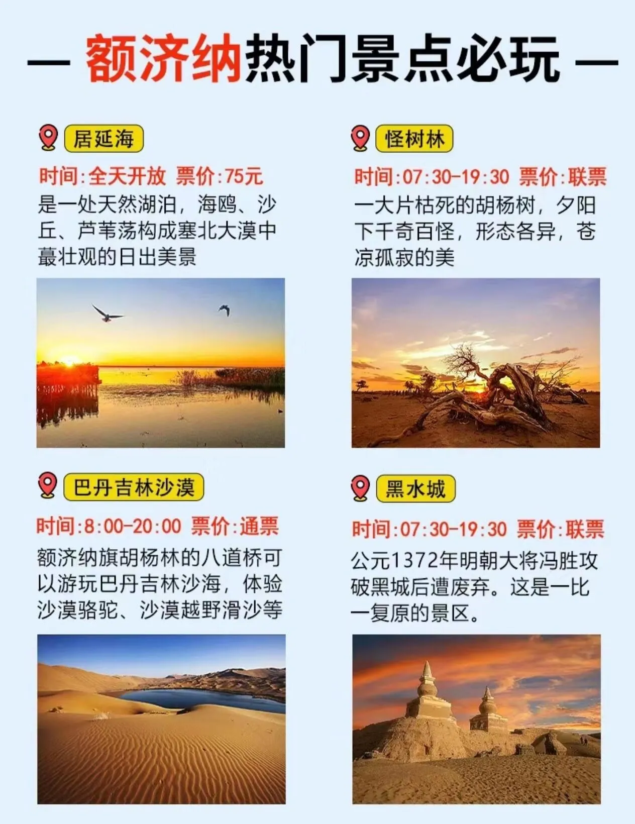 这些行程安排涵盖了额济纳旗胡杨林及周边的主要景点,让游客能够充分领略金秋胡杨的魅力,同时体验丰富的西北风光。