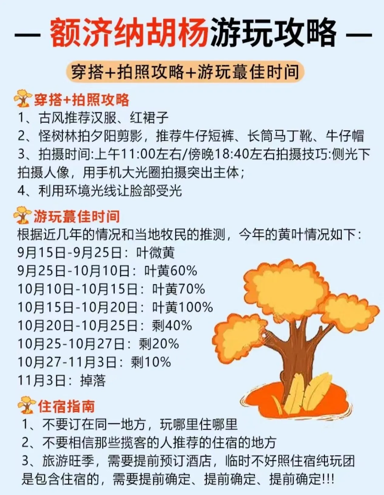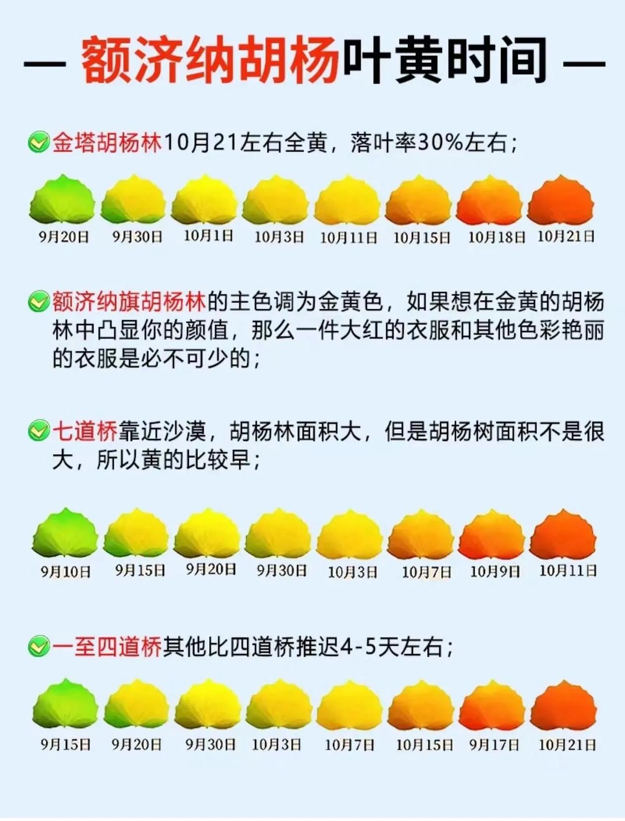 9月25日至10月1日:胡杨林呈半黄半绿状态,适合拍摄小清新风格的照片。