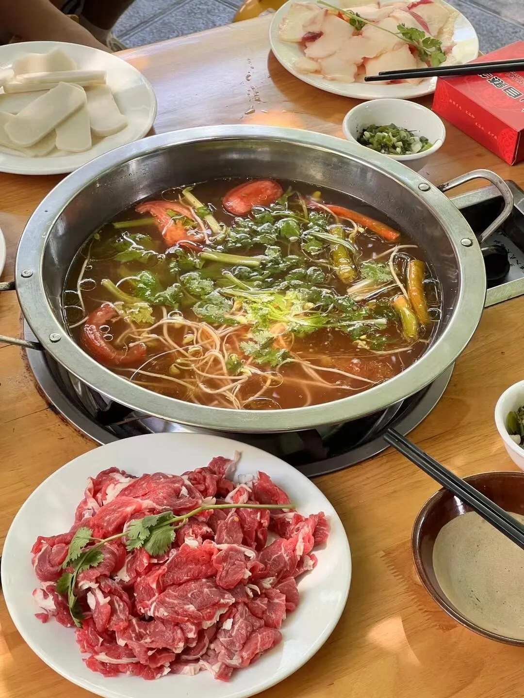 这是我吃过最舒服的一家酸汤牛肉店。酸味恰到好处,不会盖过牛肉的奶香味。除了牛肉,推荐点一个牛黄金加千层肚的双拼,三种食材的品质都很不错。吃完牛肉后一定要煮些蔬菜,这个汤煮出来的蔬菜居然是脆脆的,很神奇。他们家还可以点炒菜,如果时间紧张的话可以一次性打卡两种不同类型的美食。