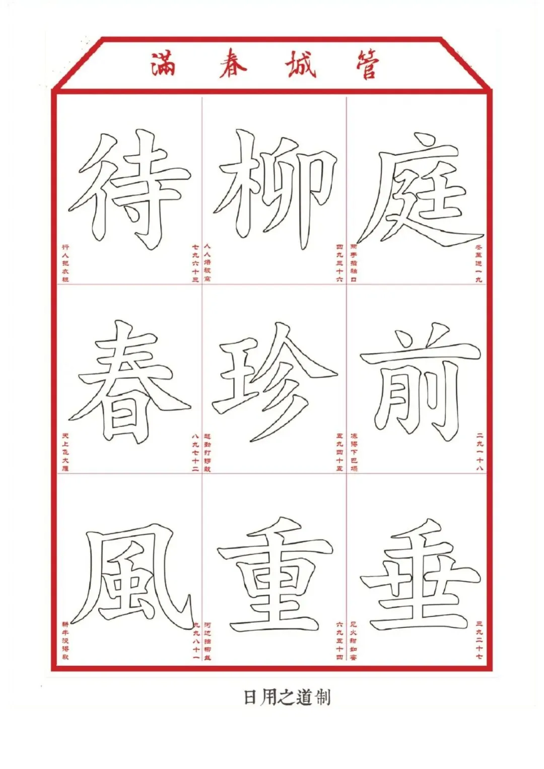 ,古人在寒冷天气来临时会开始临摹印有九个字且每个字为九笔的双钩描红图,如“亭前垂柳珍重大春风”,每天临摹一个笔画,八十一天后,涂满整幅,便是“春满管城”之时。
