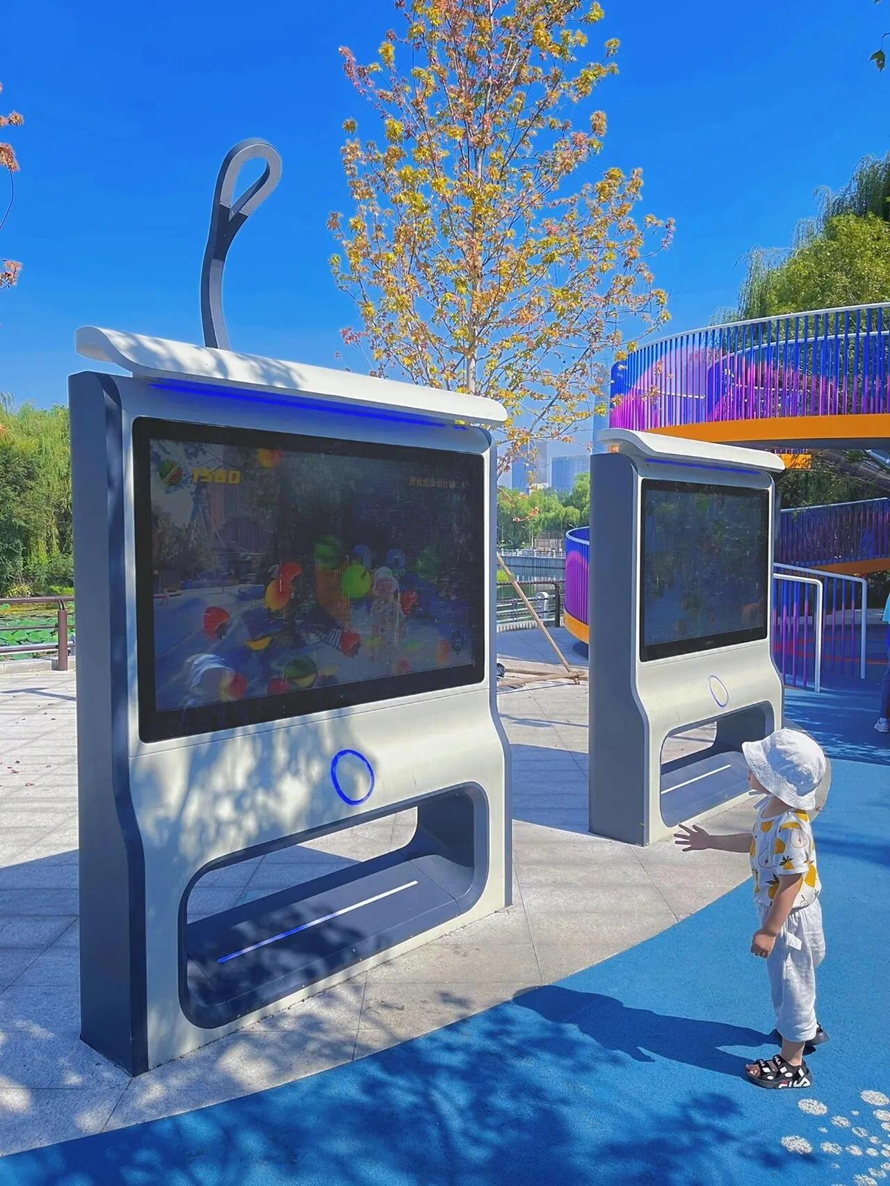除了常见的游乐设施,这个口袋公园还有其他地方没有的互动游戏电子屏。孩子们可以在上面玩切西瓜、踢毽子,甚至还有寻宝游戏,非常有趣。