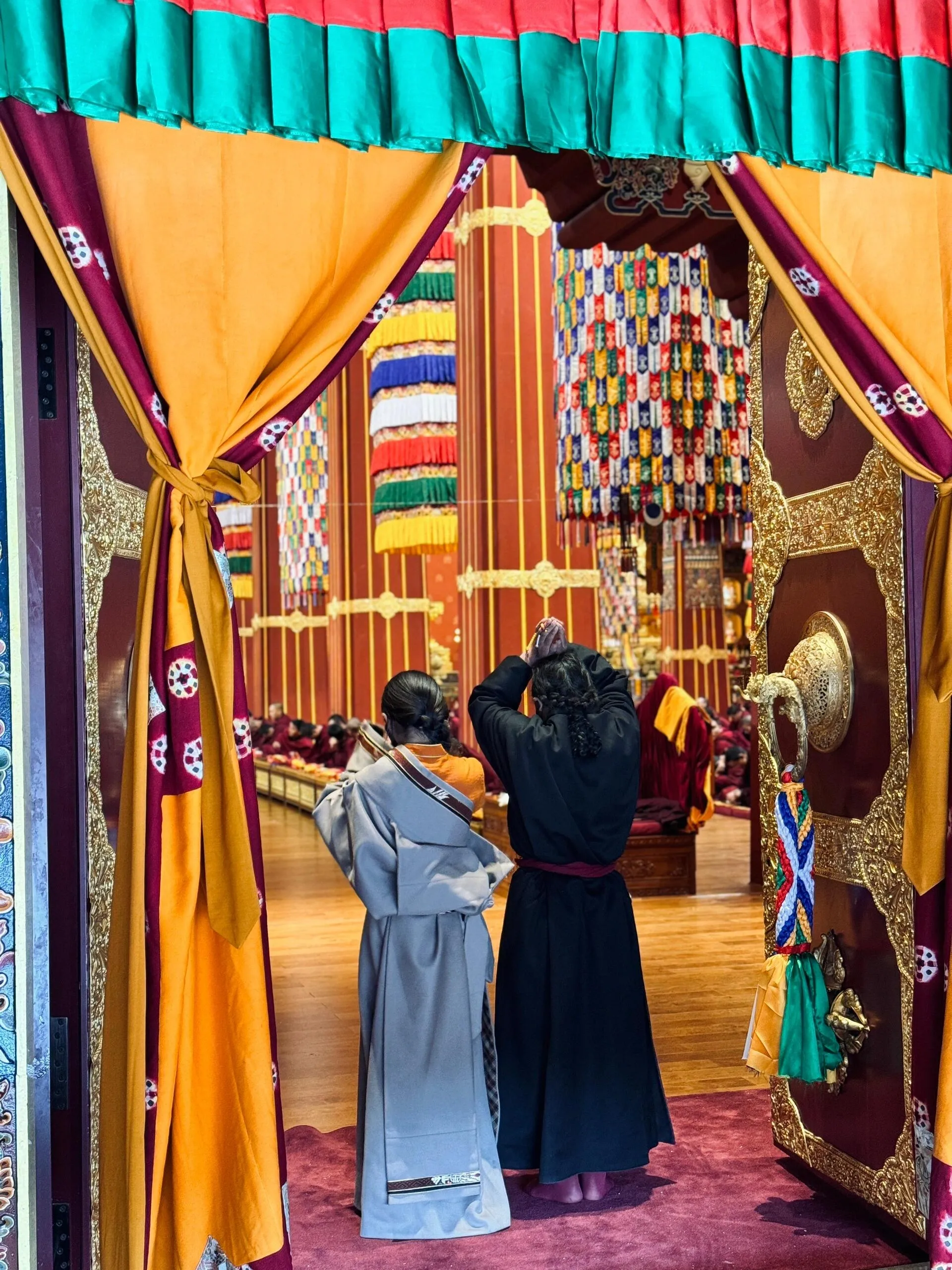 竹庆寺始建于明朝,属藏传佛教宁玛派。寺庙背靠雪山,面临湖泊,湖中倒映着寺庙的倒影,在6000多米高的雪山脚下,宛如仙境。抵达竹庆寺需要经过一段颠簸的乡道,雨后尤其泥泞。寺院规模宏大,内藏大量珍贵文物,如唐卡、经书和佛像等。当地僧人友善,允许在佛学院内参观拍摄。寺内氛围肃穆庄严,经幡飘扬,诵经声不绝于耳,令人心生敬畏。图书馆藏书丰富,甚至有藏文版的《父与子》漫画。