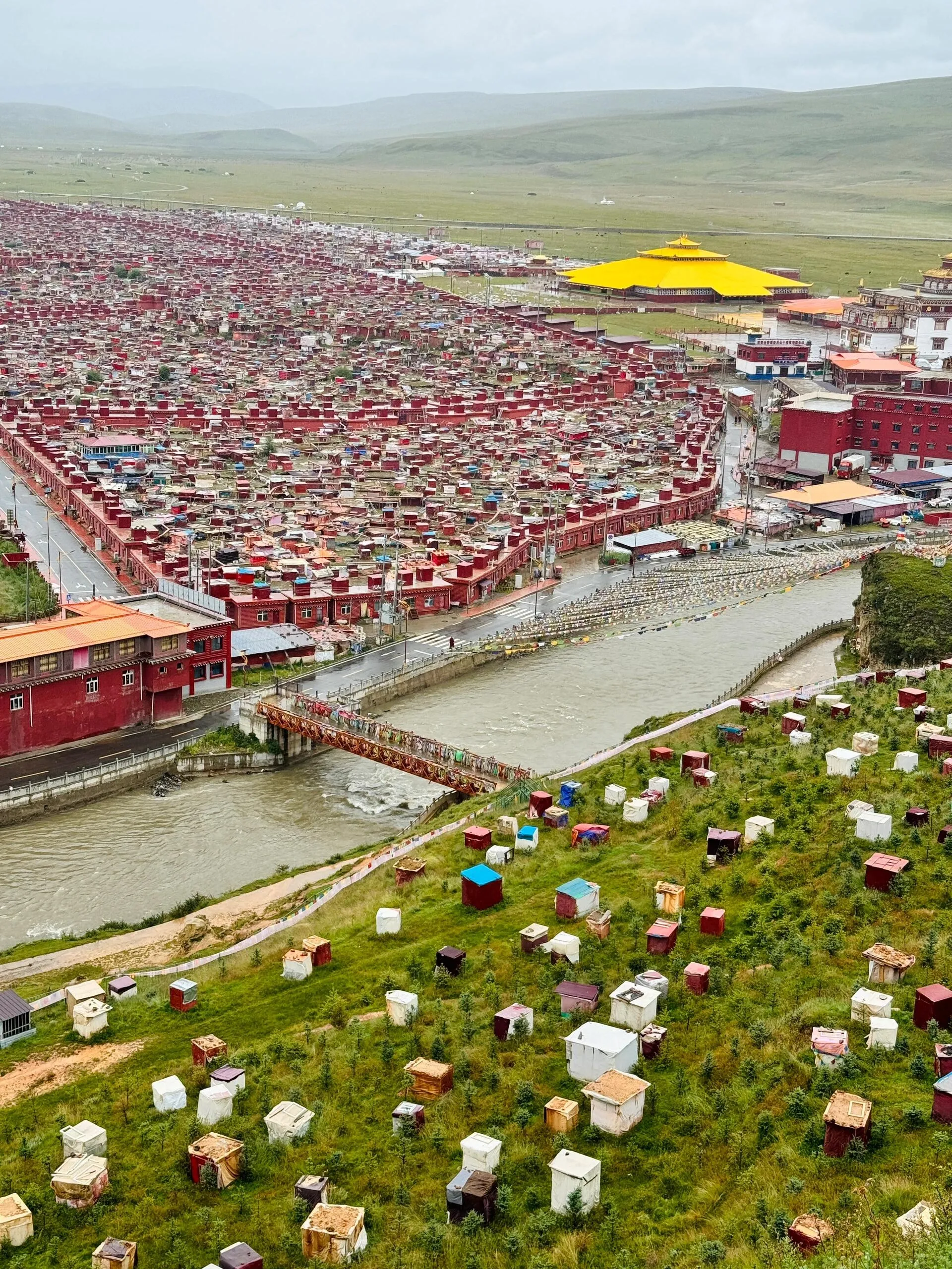 亚青寺属宁玛教派,是世界上女僧人集体修行最多的地方。寺西山坡上的莲花生大士雕像是观赏觉姆岛的最佳位置。山坡上的小木箱供僧侣闭关修行,冬季时僧侣们在此进行为期百日的苦行,展现了强大的精神力量。