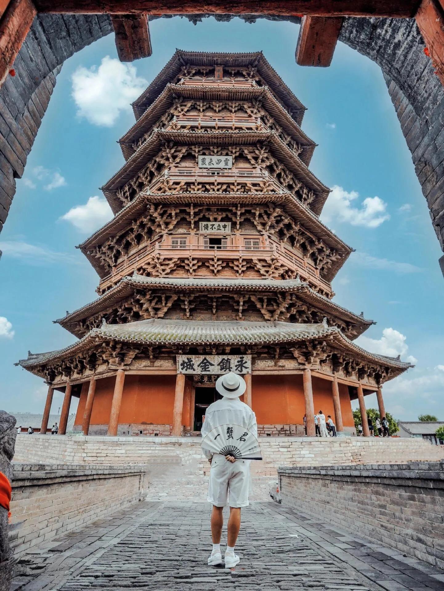 应县木塔是世界现存最高的纯木结构建筑,从大同自驾约1小时可到。这里游客较多,拍摄需要耐心等待和眼疾手快。临近景区关门时人流会减少,可以快速打卡门洞同框木塔的热门机位。