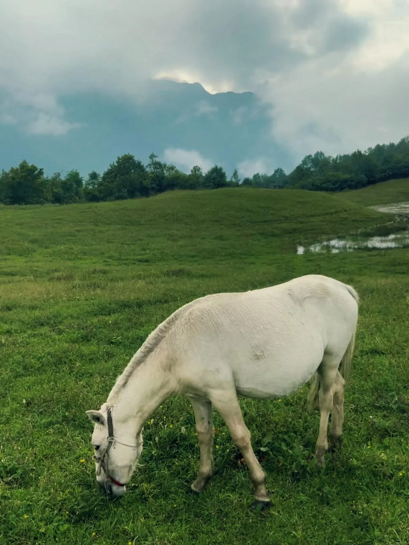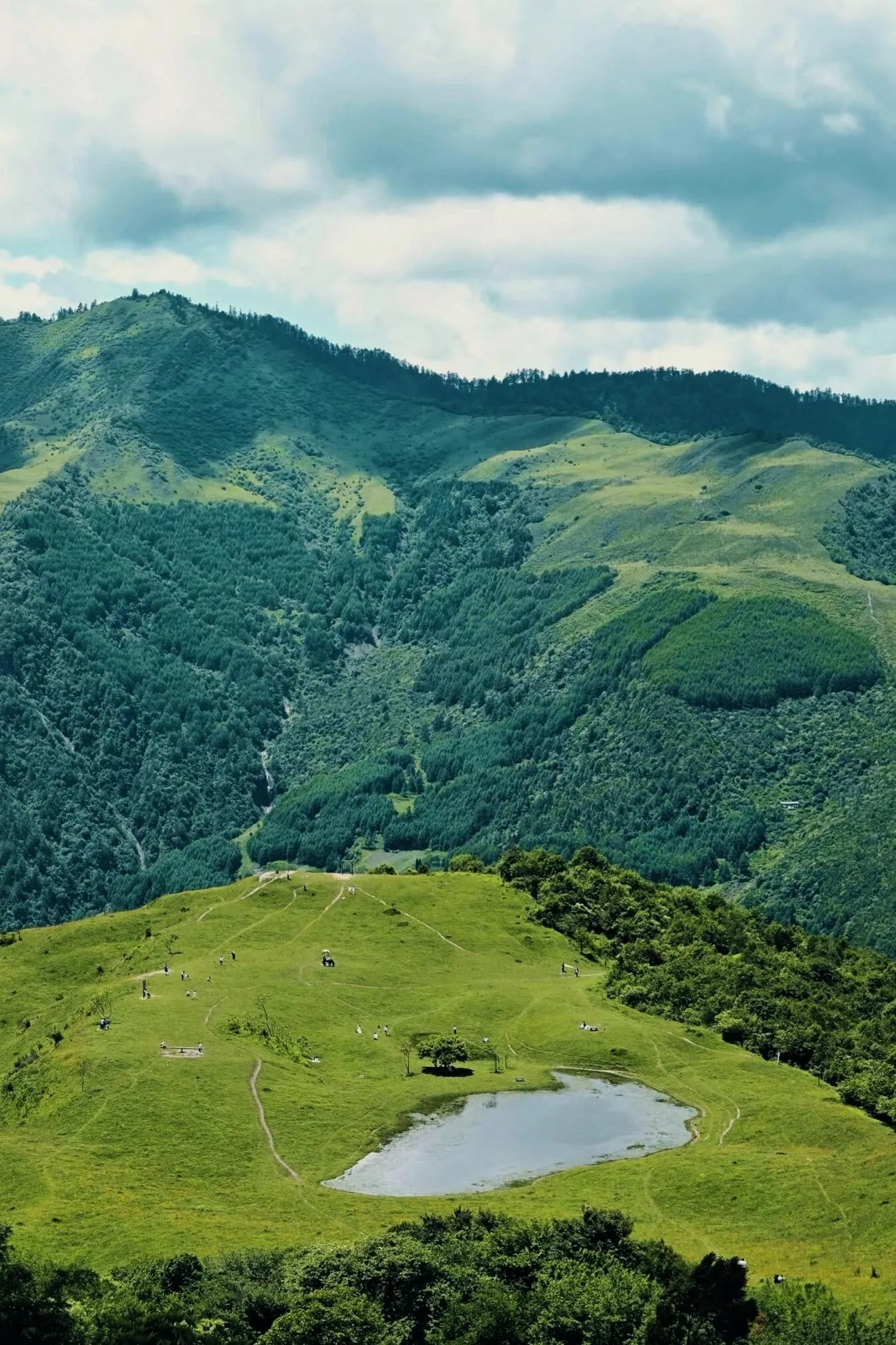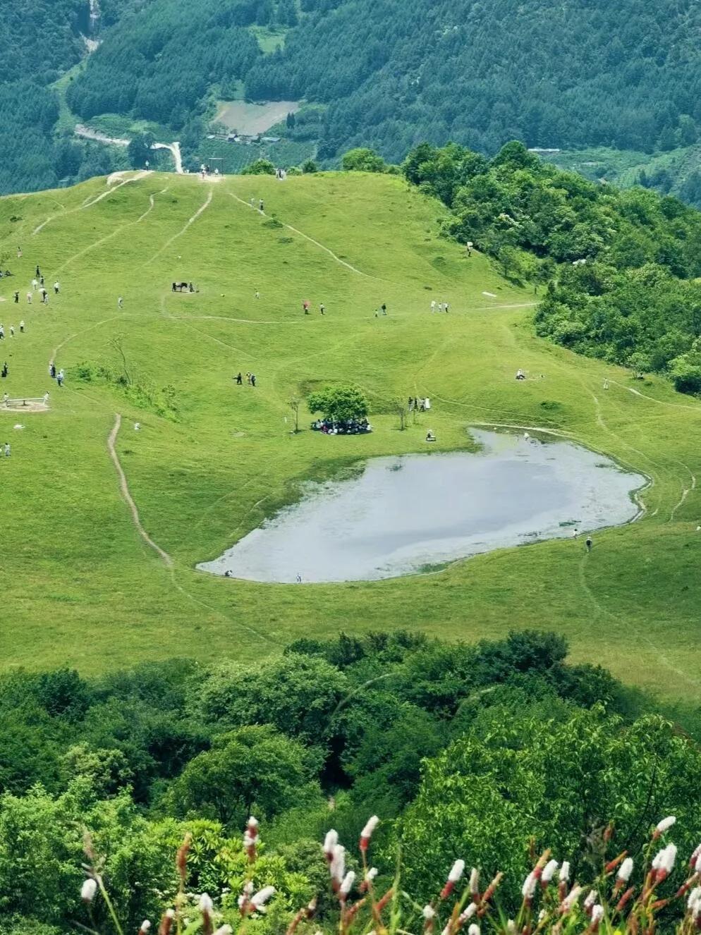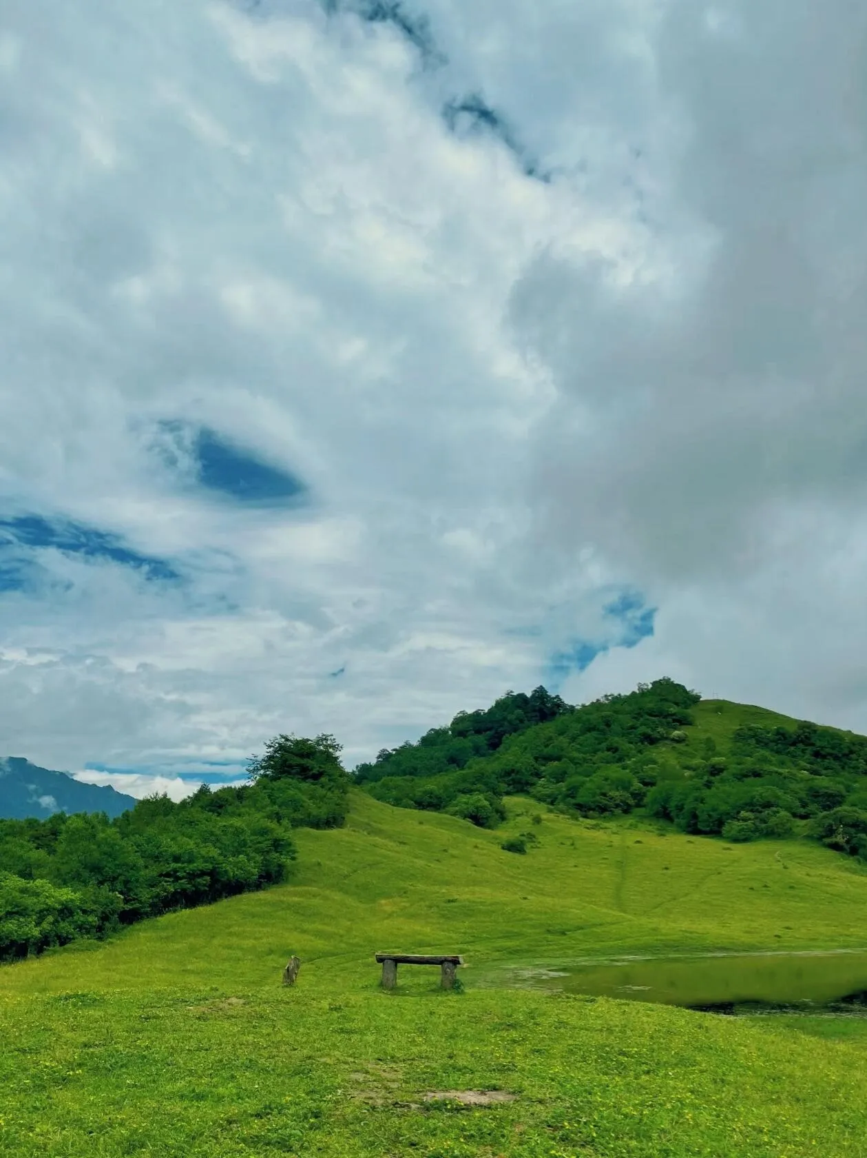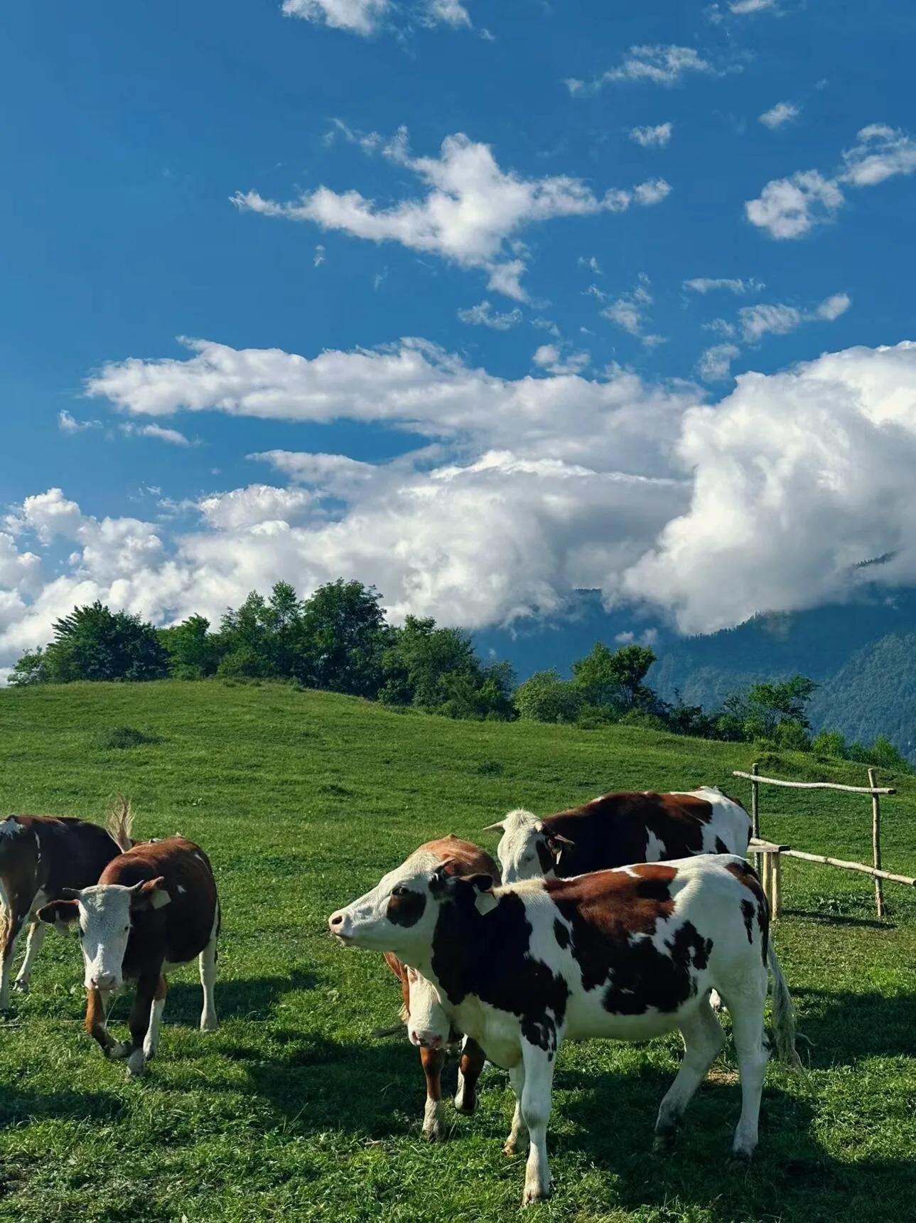 徒步路线往返5公里,全程石板路,难度适中。沿途风景如诗如画,绿色草甸铺展开来,偶尔还能看到悠闲的牛群和马匹。山顶设有云中秋千和跷跷板,是拍照打卡的绝佳地点。