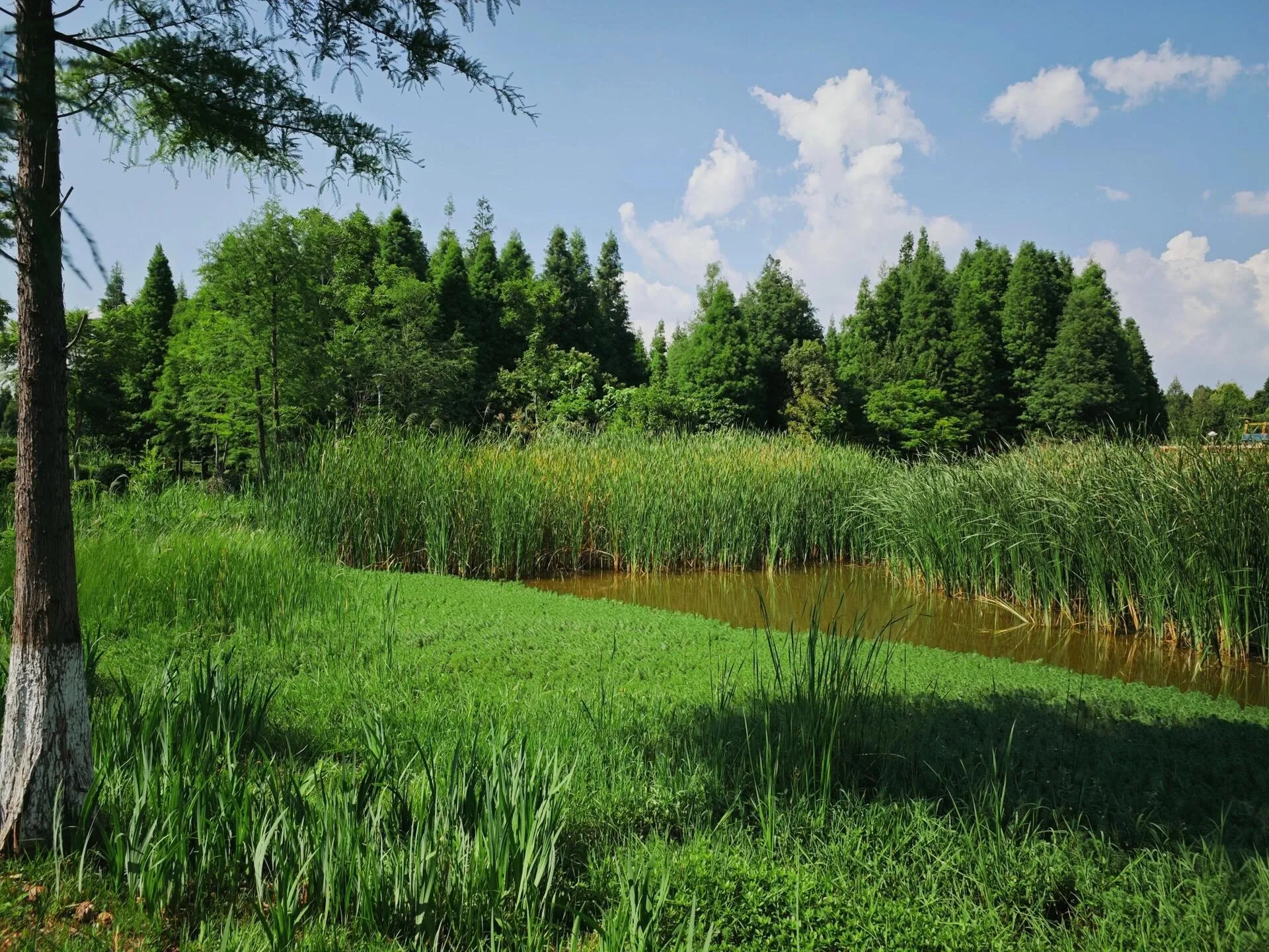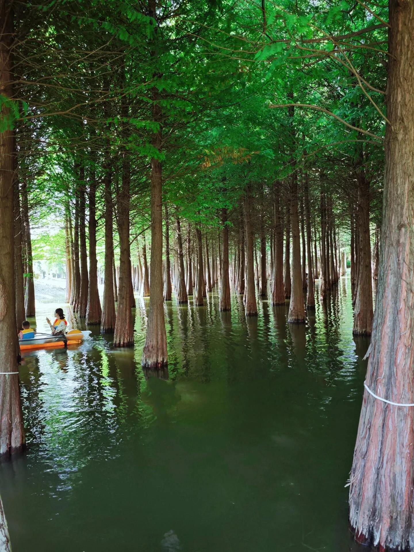 之后来到了海洪湿地。 这里人很少,风景却极为优美 ,非常适合全家露营。 水杉林中还可以划船,在炎炎夏日里格外清凉 。