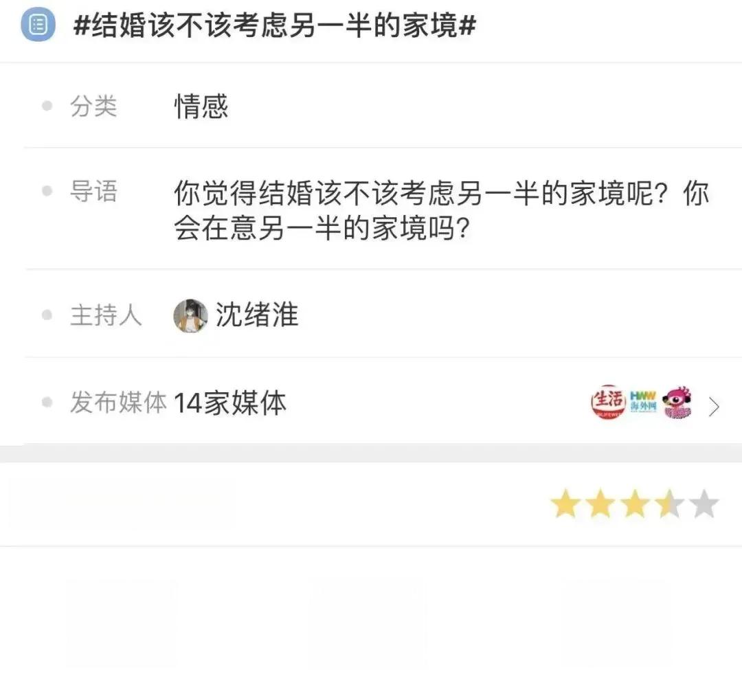 前段时间,关于“结婚该不该考虑另一半的家境”的话题,登上了微博热搜,吸引了上亿网友的关注。