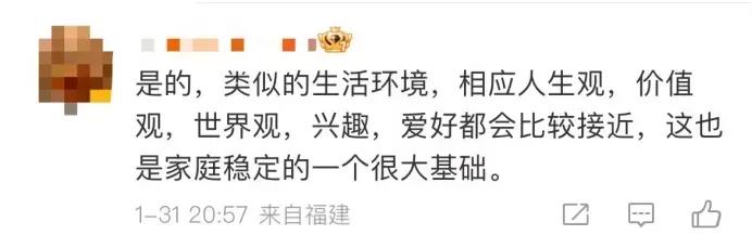因为相似的生活环境,也将让两人的人生观、价值观、世界观、兴趣爱好更加接近,这也是维持家庭稳定的重要基础之一。”