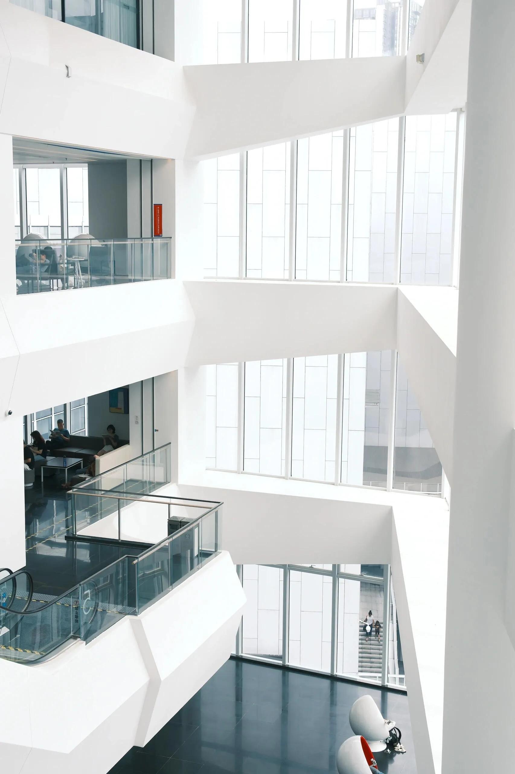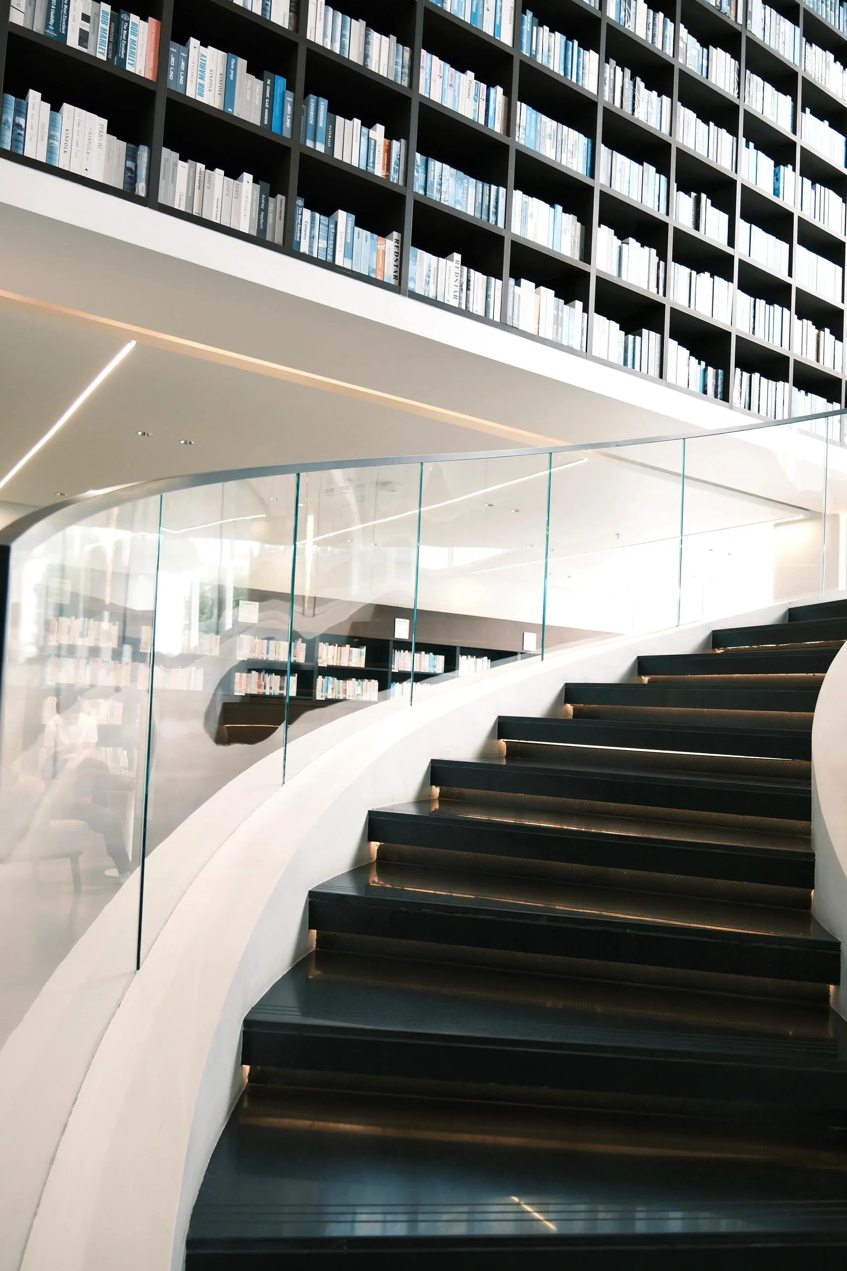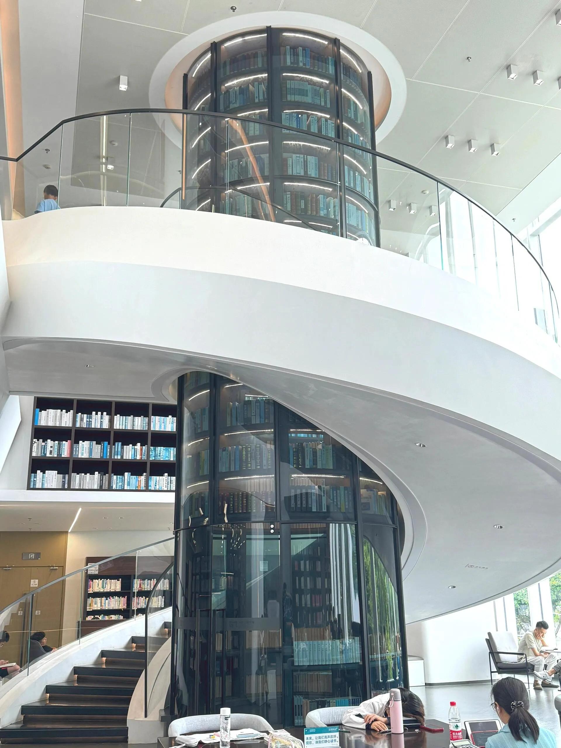 螺旋玻璃书圆塔:图书馆三楼连接到四楼,环形包围书屋盘旋而上,宁静感拉满
