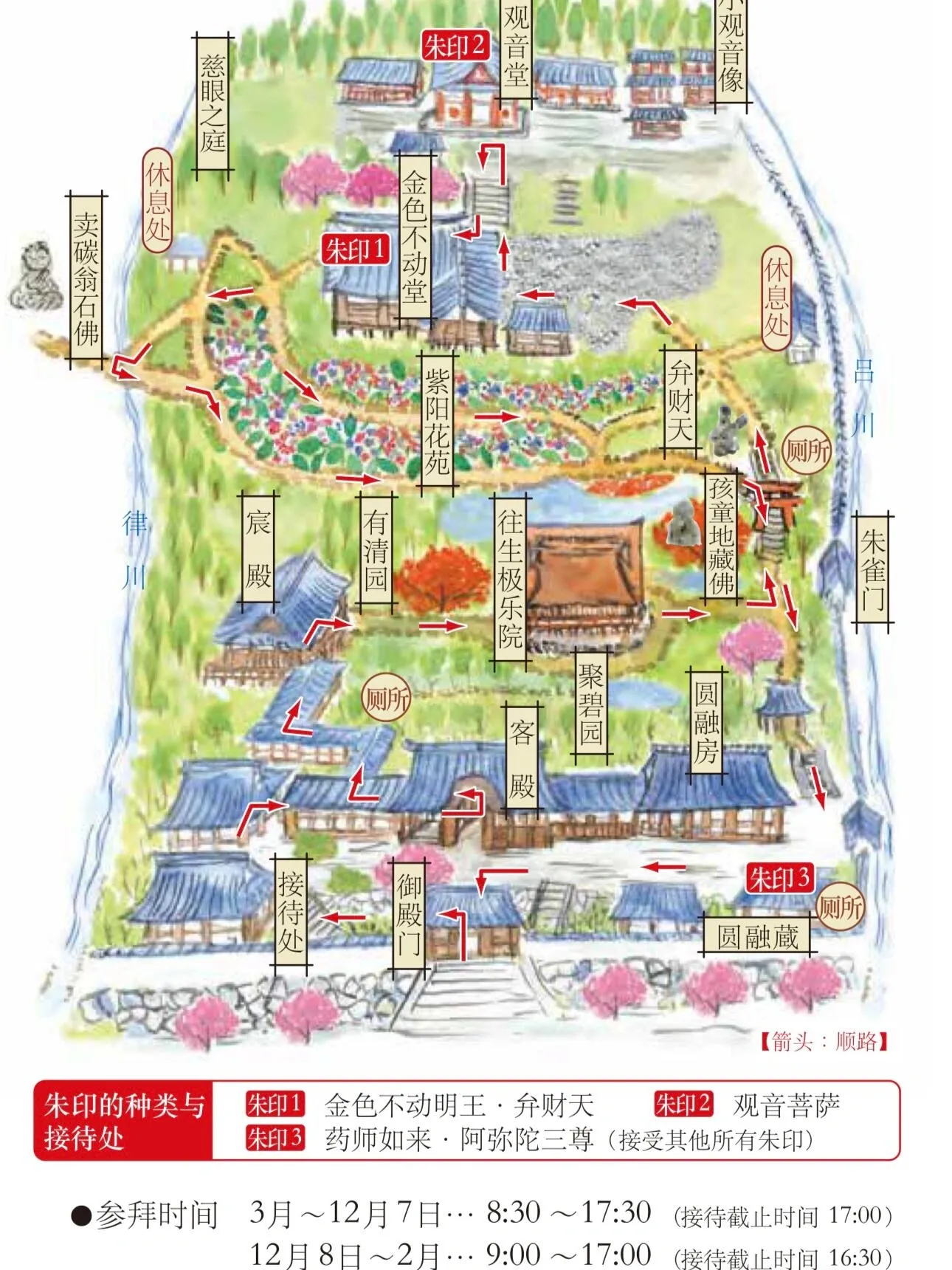 三千院全年开放,但不同季节会呈现不同的景色。春季可赏樱花,夏季有紫阳花盛开,秋季则以红叶闻名,冬季则可欣赏雪景。 无论何时来访,三千院都能给人以深刻的印象和内心的平静 。