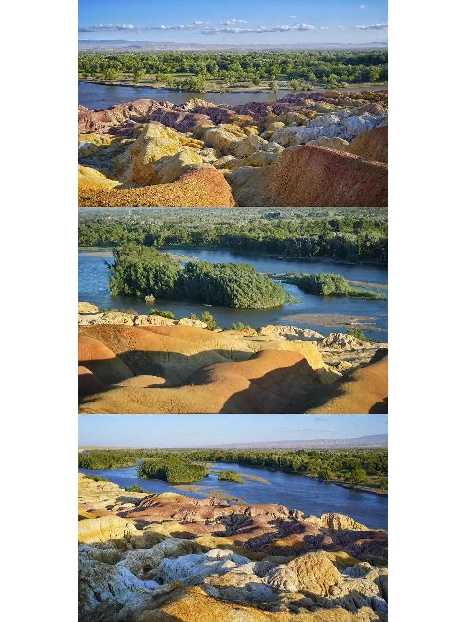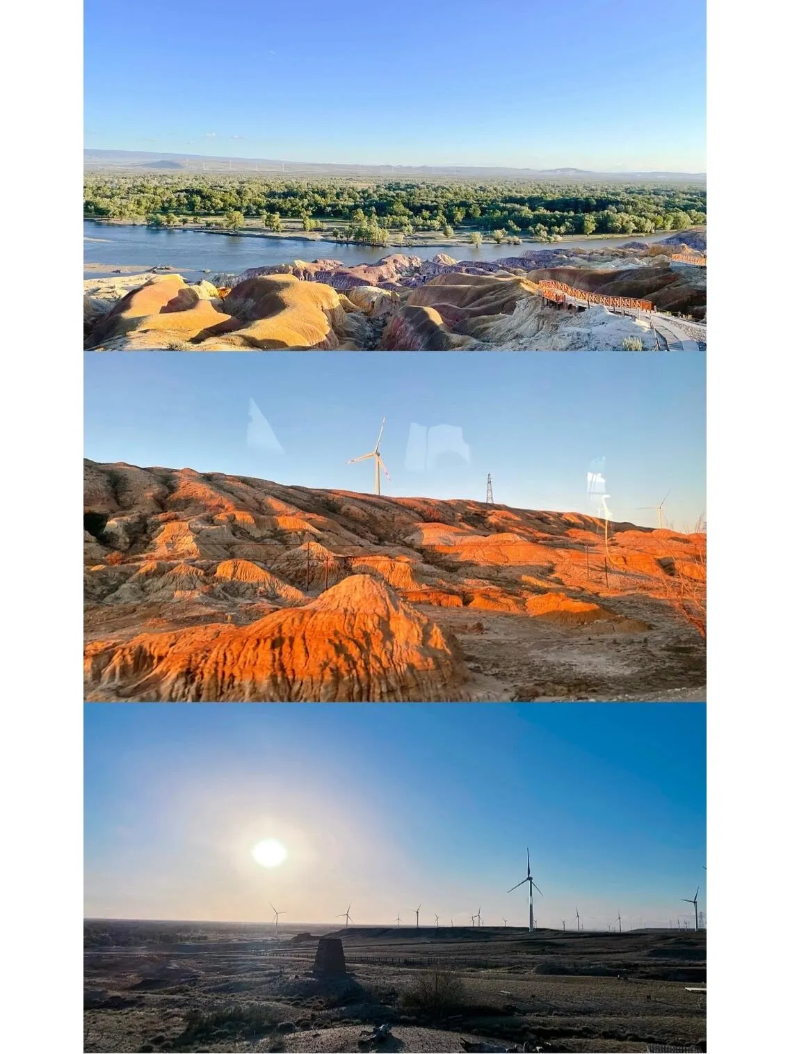 作为去喀纳斯的必经景点, 五彩滩还是值得打卡一下的。 它位于新疆布尔津县城西北约24公里处的额尔齐斯河北岸,以独特的雅丹地貌著称。 这里的丘陵地质奇特 ,到了傍晚时分,夕阳照耀下的五彩滩颜色绚烂多姿。 河对岸是一片茂密的胡杨林 ,倒映在河水中,构成了一幅美丽的画面,非常适合拍照。景区前还有大型的风力发电站,增添了现代化的元素。