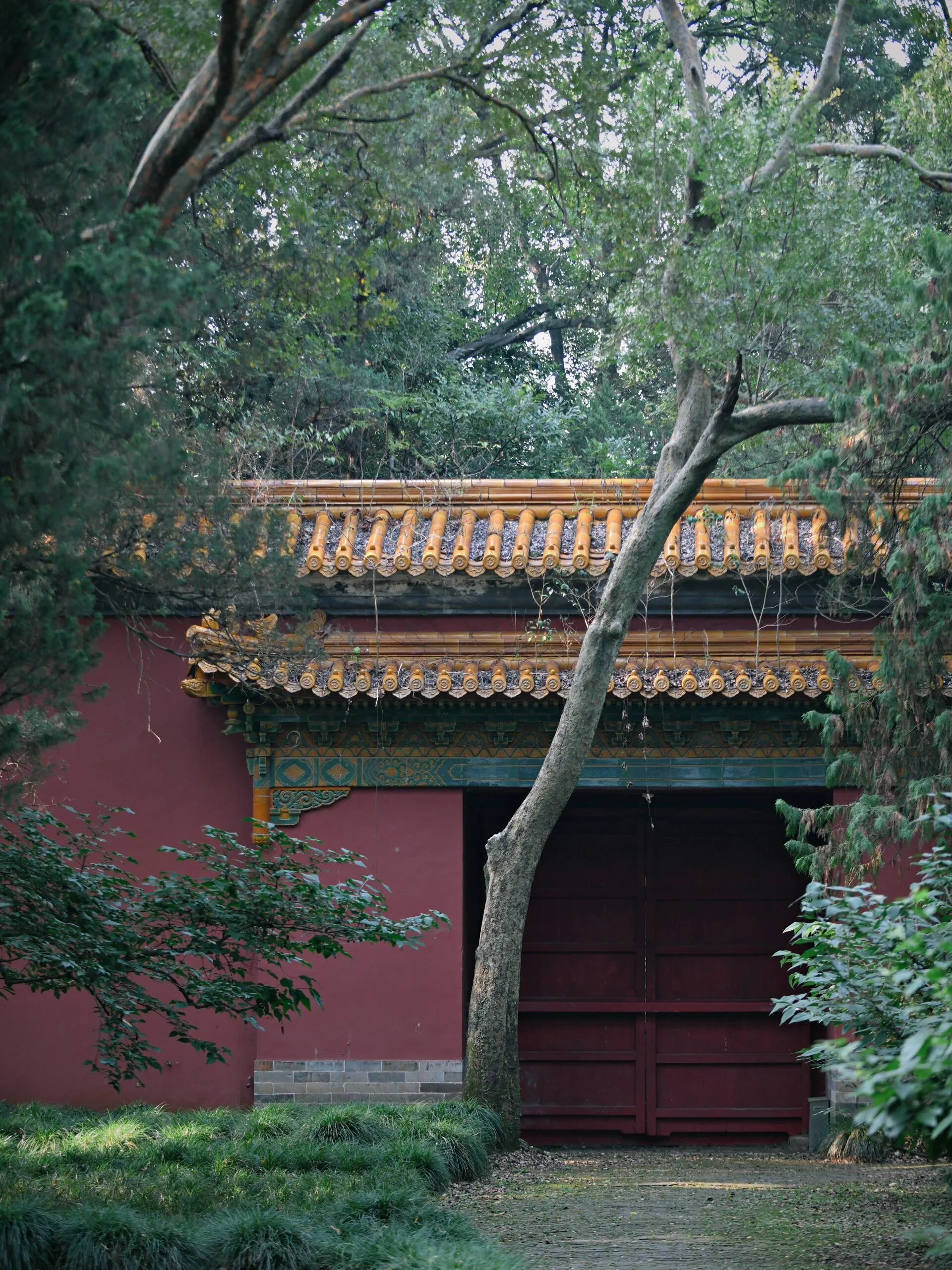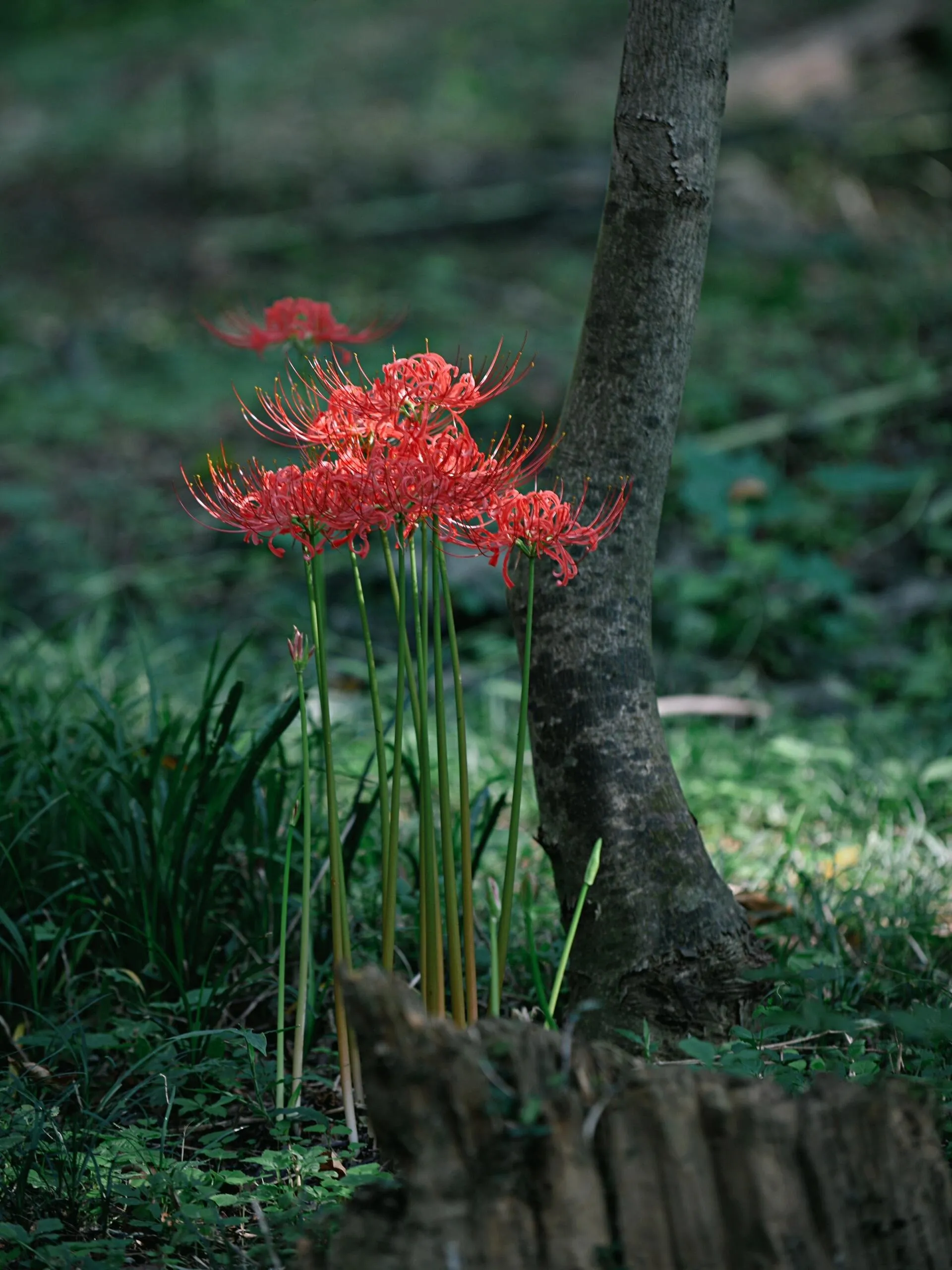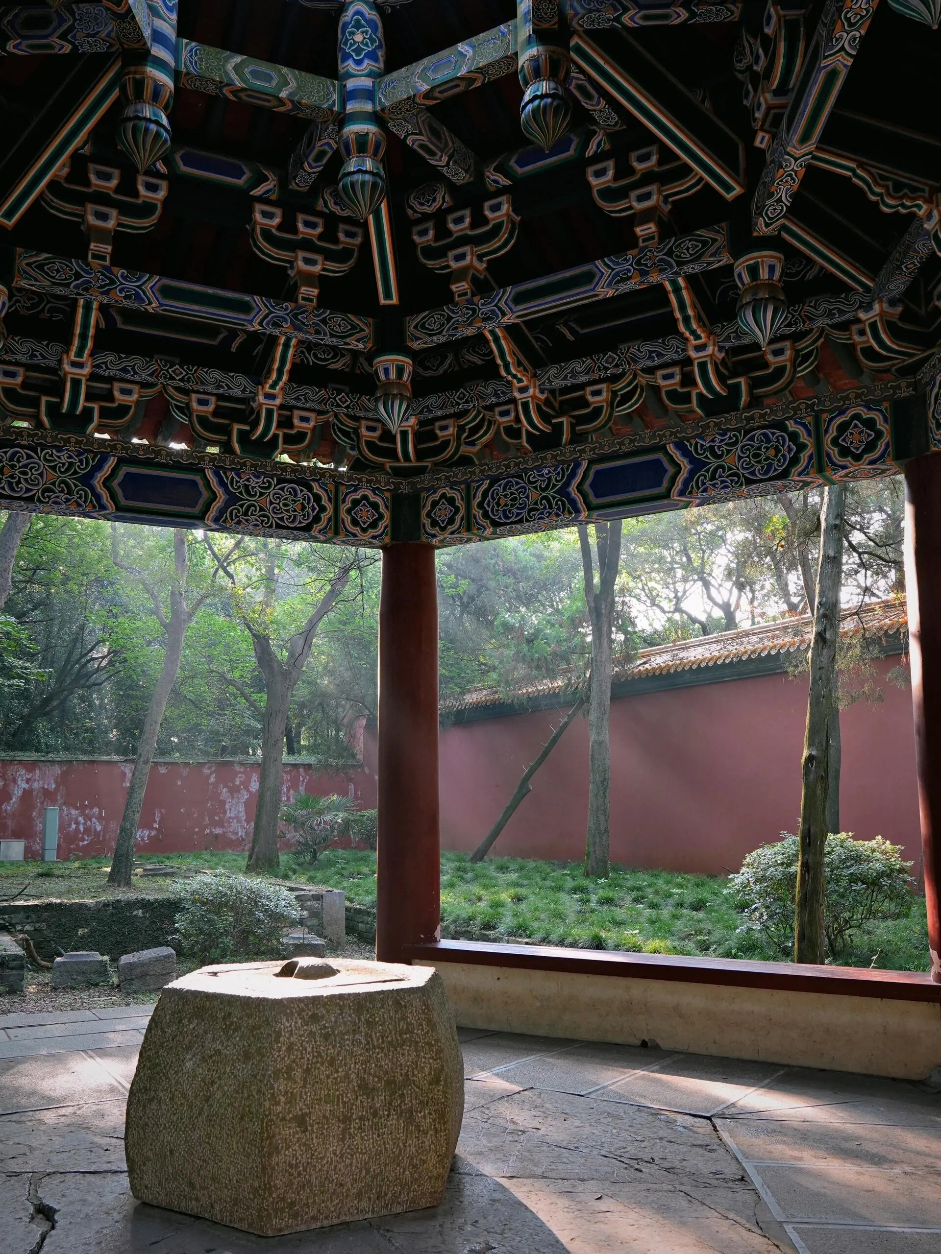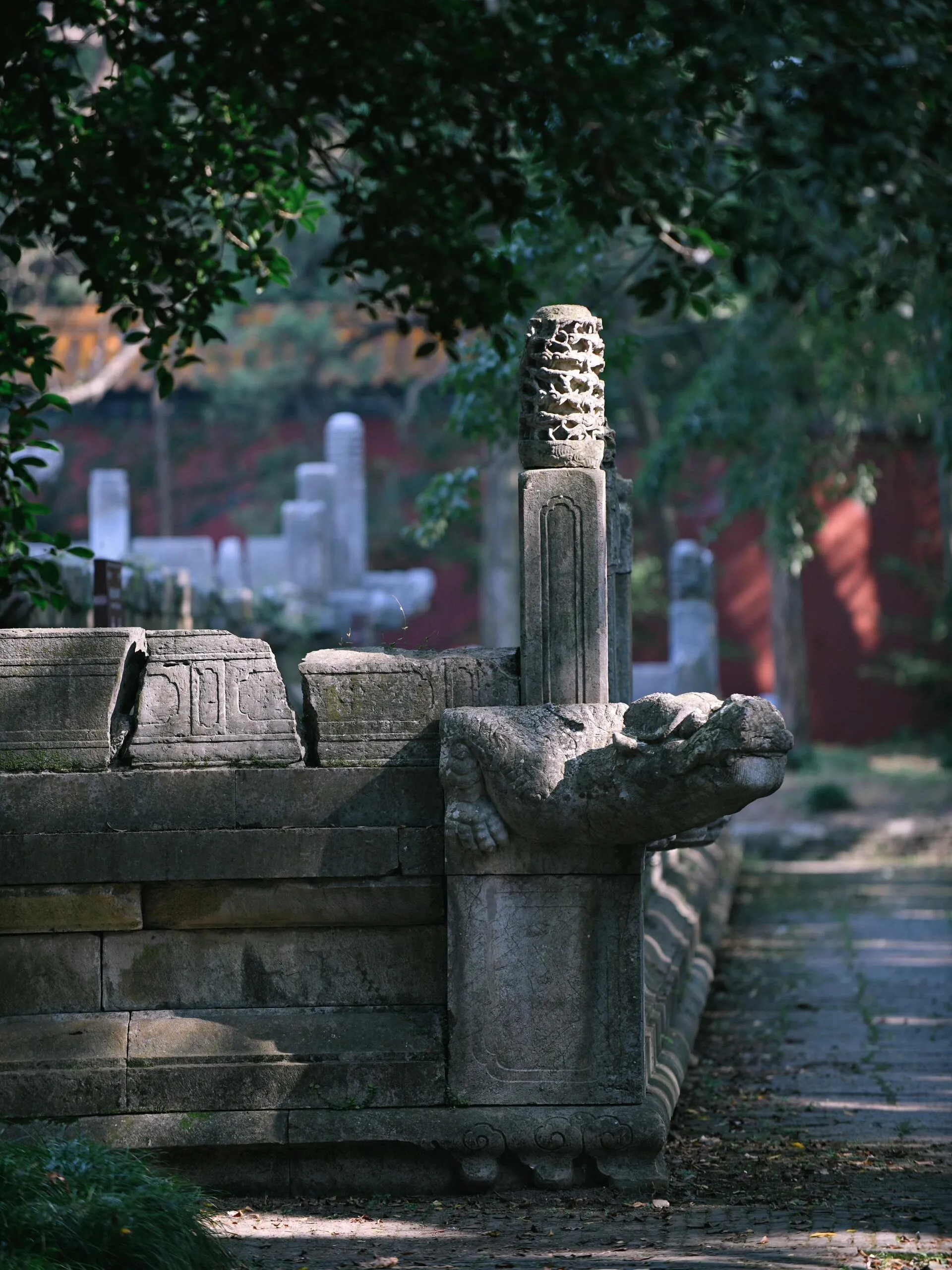 在南京,欣赏彼岸花最佳的地点有两处。其中之一是灵谷寺,另一处则是明孝陵的享殿。 享殿曾是供奉朱元璋及其皇后、嫔妃牌位的场所 ,拥有三层石造须弥座台基,面阔九间,进深五间的巨大木结构殿宇。如今,这里仍保留着56个石柱础,以及不少螭首(古代传说中一种没有角的龙)石刻。
