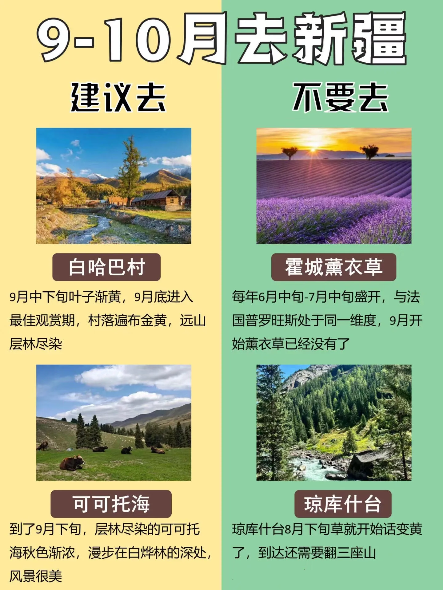 值得一提的是,伊犁地区的草原在这个时候已经开始发黄,牧民也陆续开始割草,最佳观赏期已经过去。相比之下,禾木、喀纳斯、白哈巴等地区成为秋季旅游的绝佳选择。