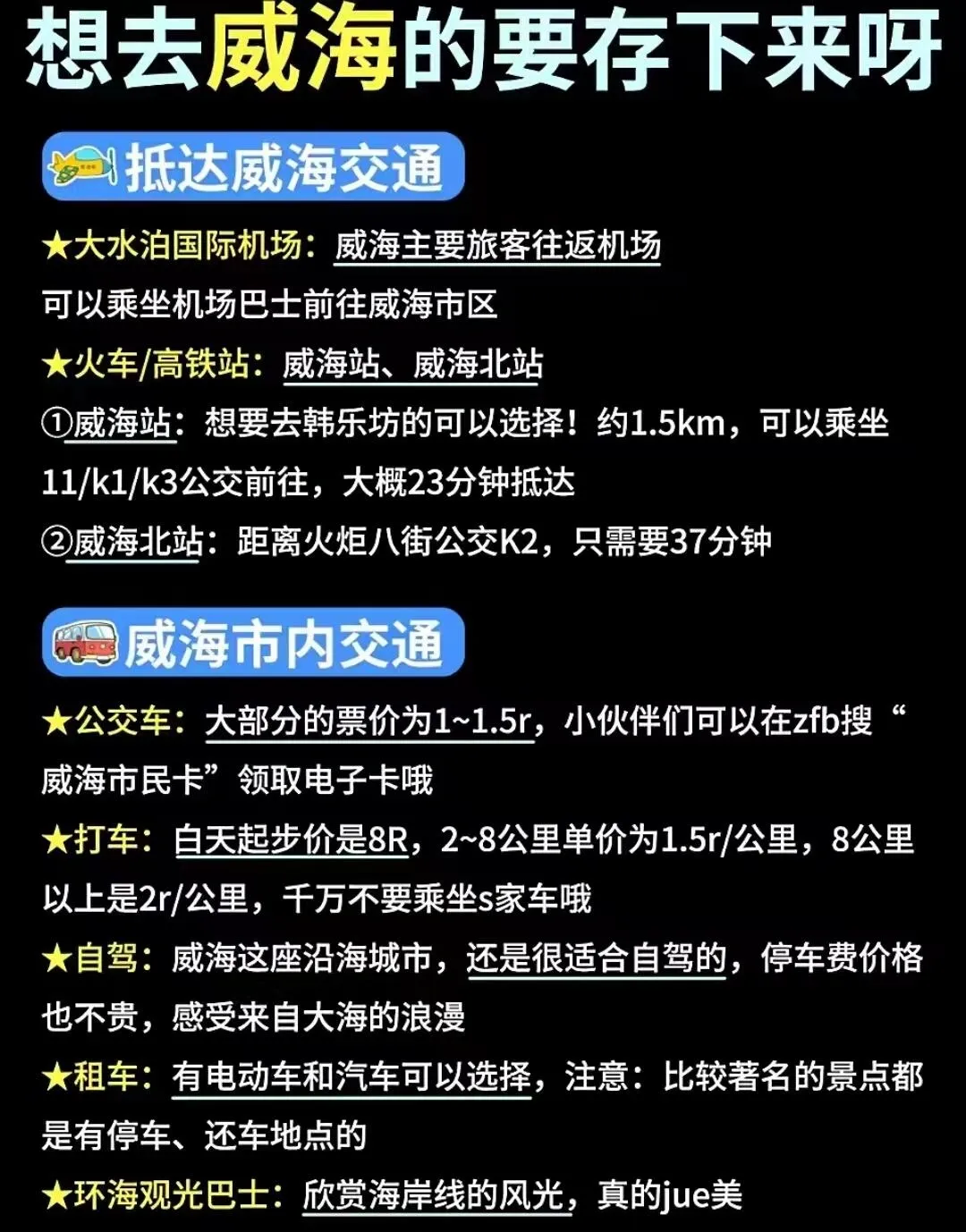 主要以租车自驾为主。威海有两个火车站:威海站和威海北站。如果从威海北站下车,可直接参考本攻略。若从威海站下车,建议将第一天和第二天的行程互换。