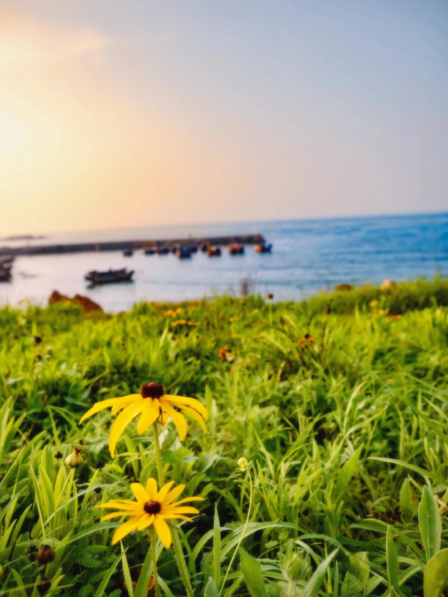 从金沙滩往东走约200米,有一个栈桥,停泊着一些废旧船舶。夏天这里还有小黄花盛开,看完日出后可以来这里坐坐,很清静。