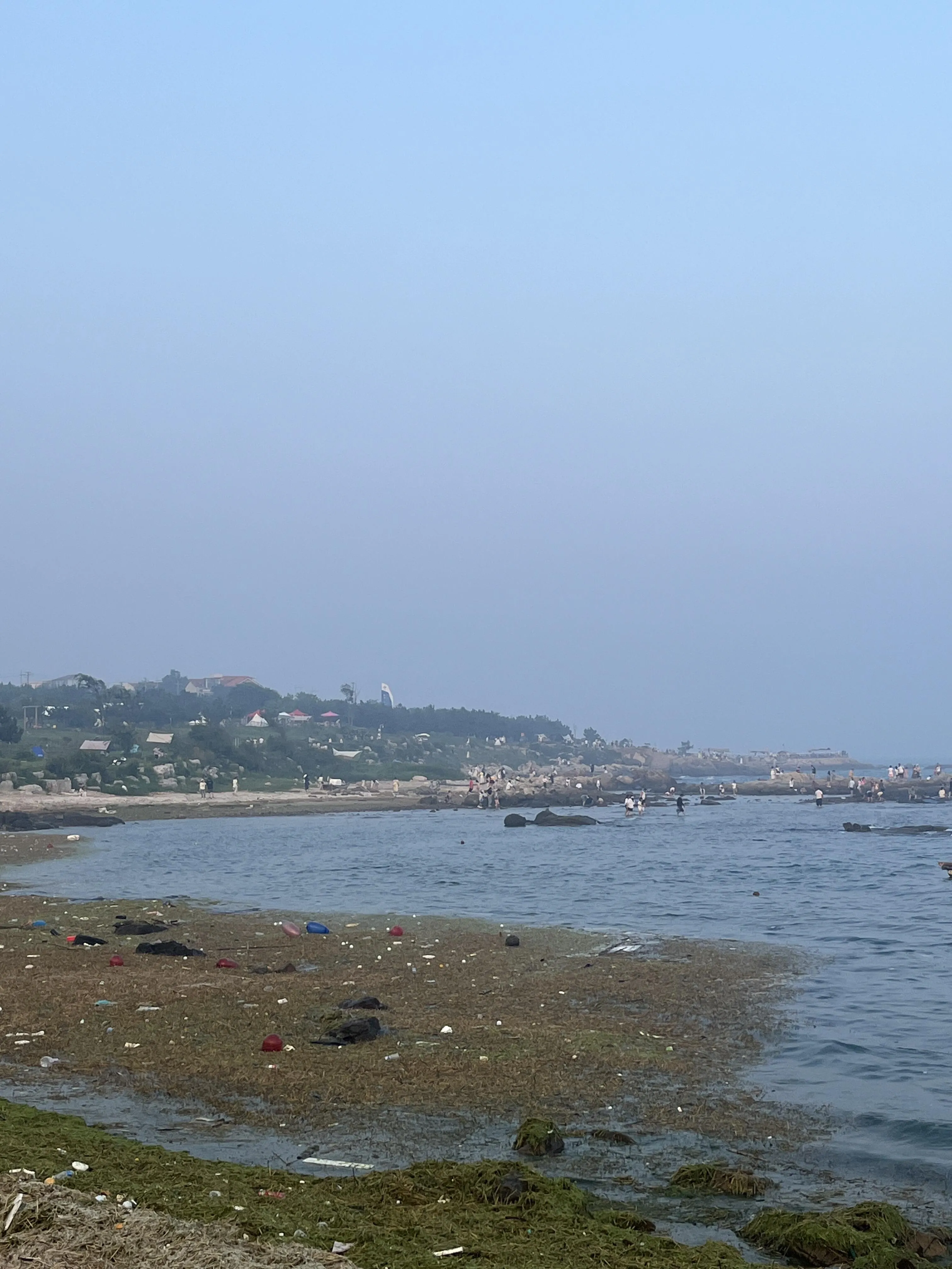 东边人比较多,有不少人在此露营烧烤。往西走会经过一片海草和垃圾较多的区域,希望环境保护工作能够加强。虽然黄岛的游客比市区少,但还是要注意保持环境清洁,不要影响了这里的自然美景。