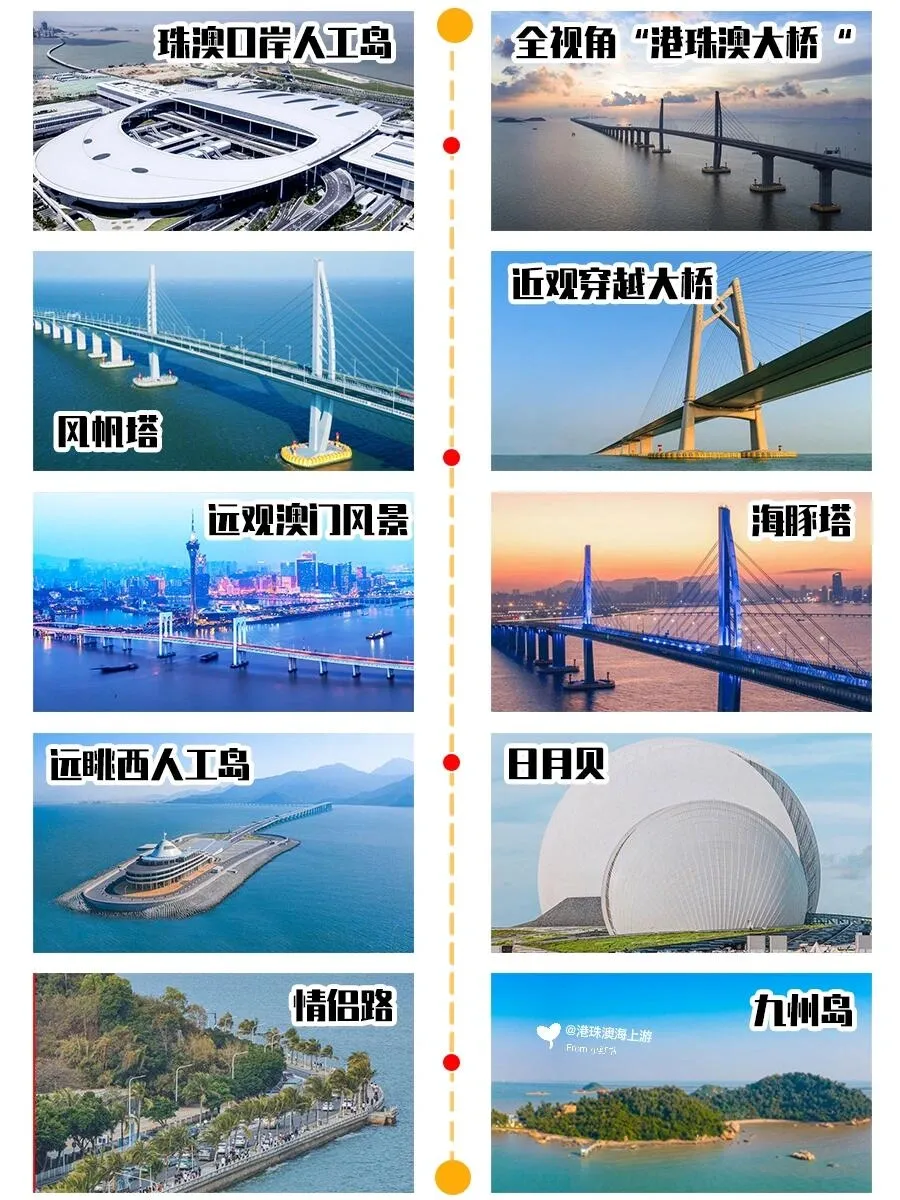 航线途经多个著名景点,包括珠澳口岸人工岛、“风帆塔”、“海豚”塔、西人工湖、珠海地标建筑日月贝、浪漫情侣路以及海上明珠“九洲岛”。 游客还可以远眺澳门的迷人风光。 整个航程中,游轮上还安排了精彩的演绎节目,丰富了游览体验。