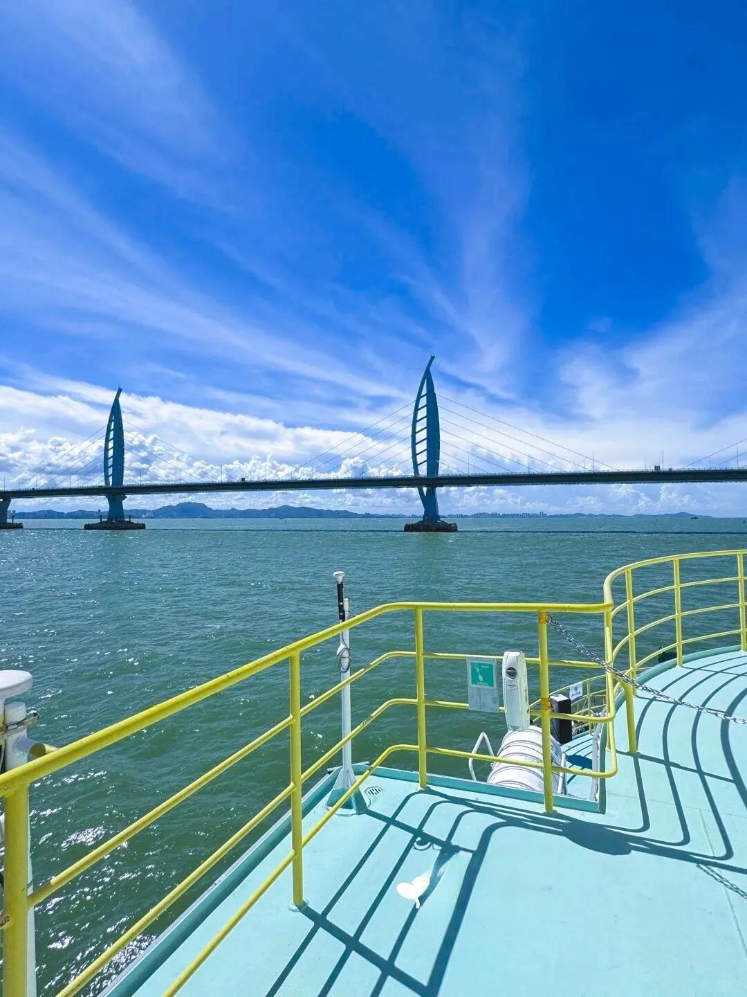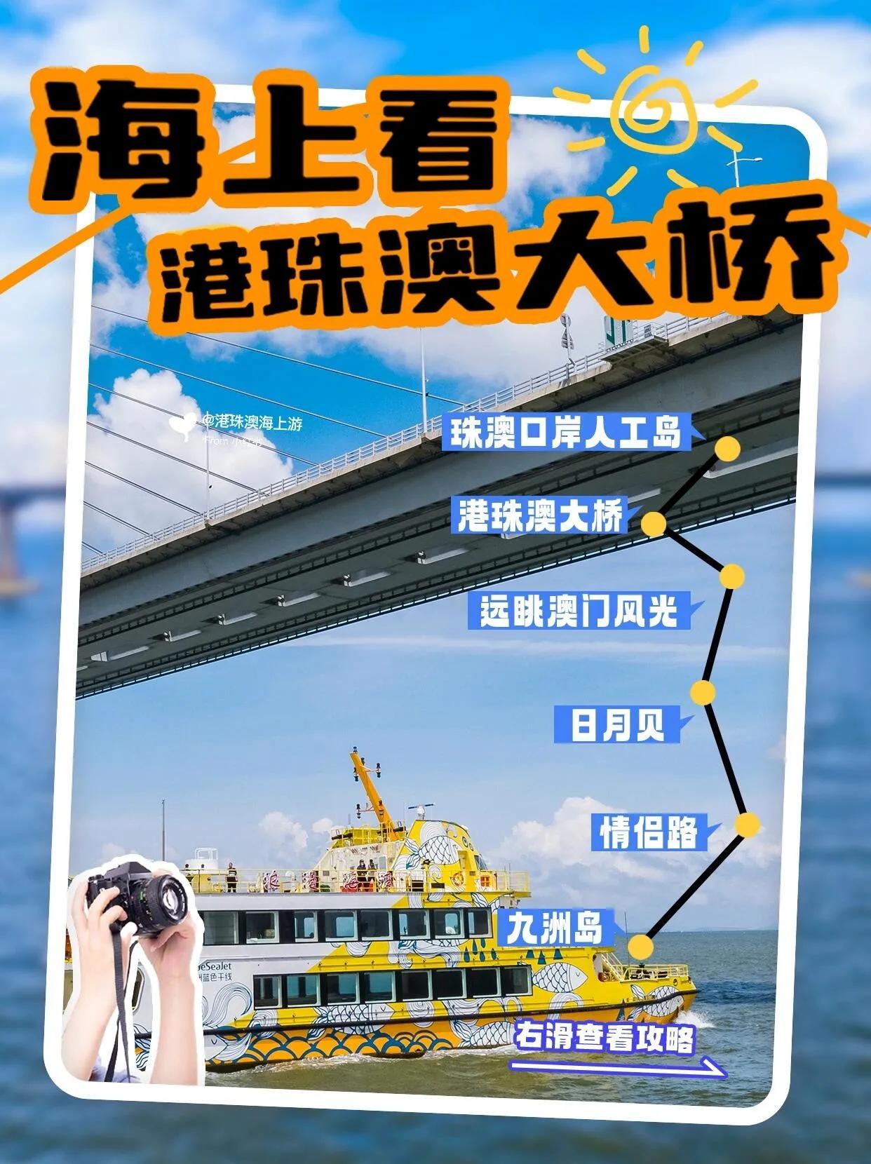 “海上看港珠澳大桥”是一条从珠海九洲客运港出发的特色航线。 乘客可以登上国内优质近海主题情景式豪华游轮, 两次穿越港珠澳大桥,全方位欣赏珠海的海上风光 ,近距离感受这座世纪工程的宏伟壮观。