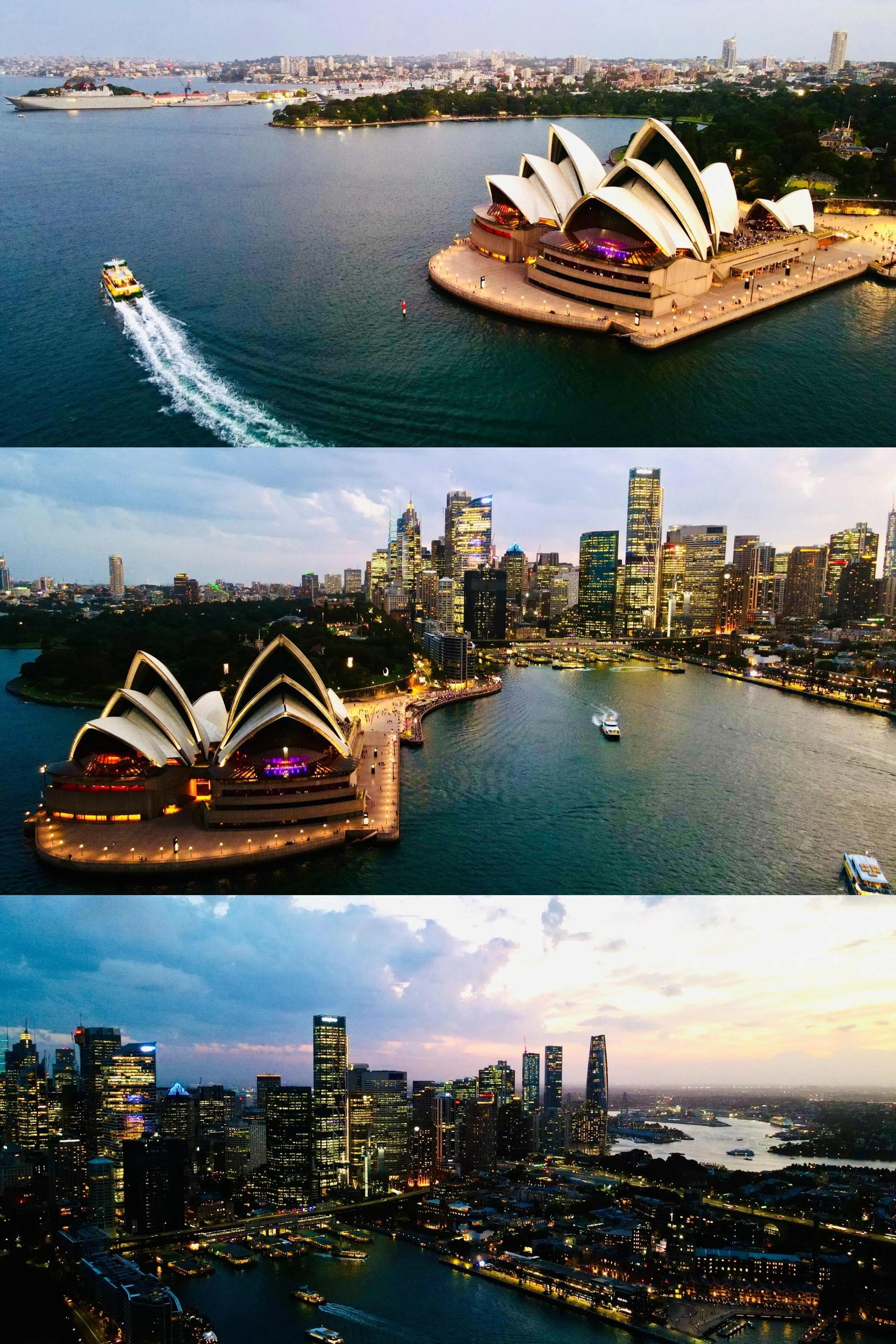 夜幕降临后,在悉尼歌剧院附近尝试飞行无人机。然而,很快就遇到了麻烦。先是两名警察前来制止,称这里是管控区域,不允许放飞无人机。之后又陆续有两波穿着反光背心的工作人员前来劝阻。虽然内心忐忑,担心会被罚款或没收设备,但最终幸运地避免了处罚。 这次经历既惊险又刺激,也算是收获了难得的航拍画面 。