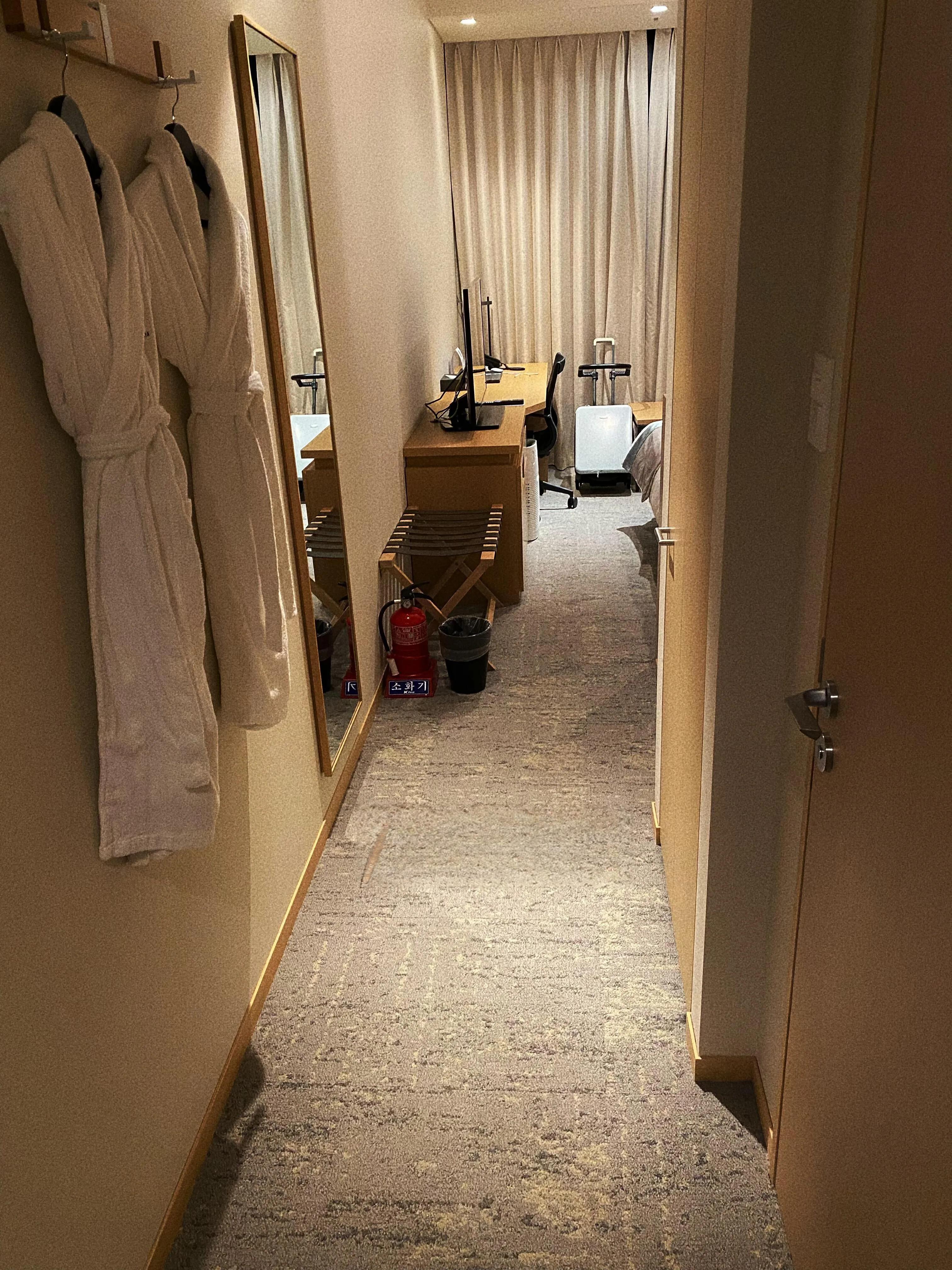 酒店卫生状况很好,看起来比较新,设备都不错。每天回来房间都会被打扫,每天会提供两瓶水。第一天入住时水是放在冰箱里的,冰箱比较隐蔽。住酒店的好处是不用自己处理垃圾分类,这在韩国是比较麻烦的事。