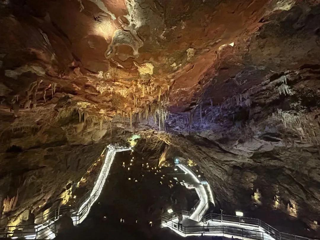 进入洞内,站在高高的引桥上,可以看到深邃的天然溶洞景观。