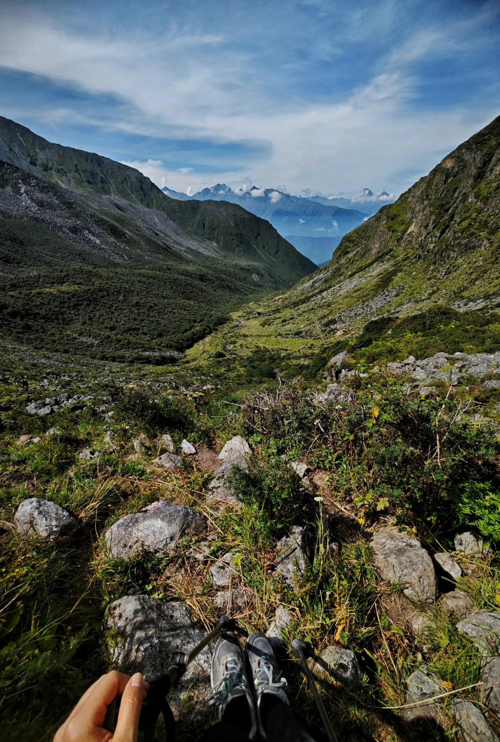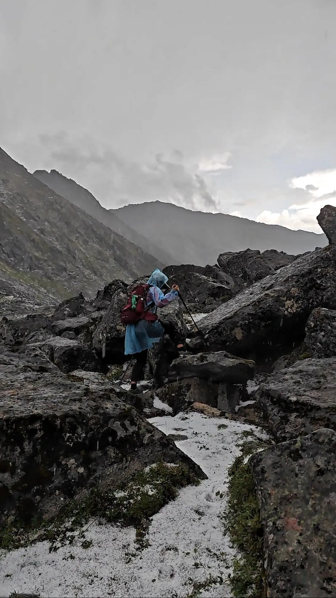 然而,户外徒步总是充满未知和挑战。在下撤途中,天气突然变化, 乌云密布,电闪雷鸣,甚至开始下起了冰雹。 这种突如其来的恶劣天气,不仅考验着体力,更是对心理和安全意识的极大挑战。所幸在找到大石头暂时躲避后,等待半小时,冰雹逐渐变小,得以继续下山。