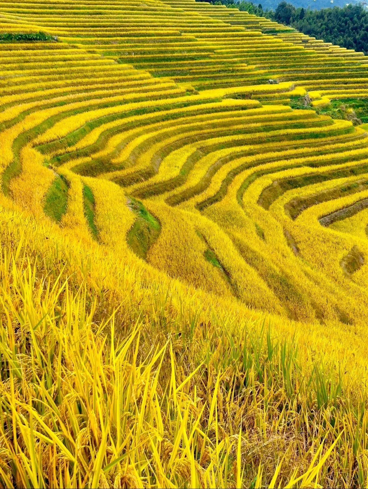 金色的梯田在阳光下闪耀,仿佛大地铺上了一层璀璨的金毯。当微风拂过,麦浪滚滚,场景如梦如幻,令人陶醉。