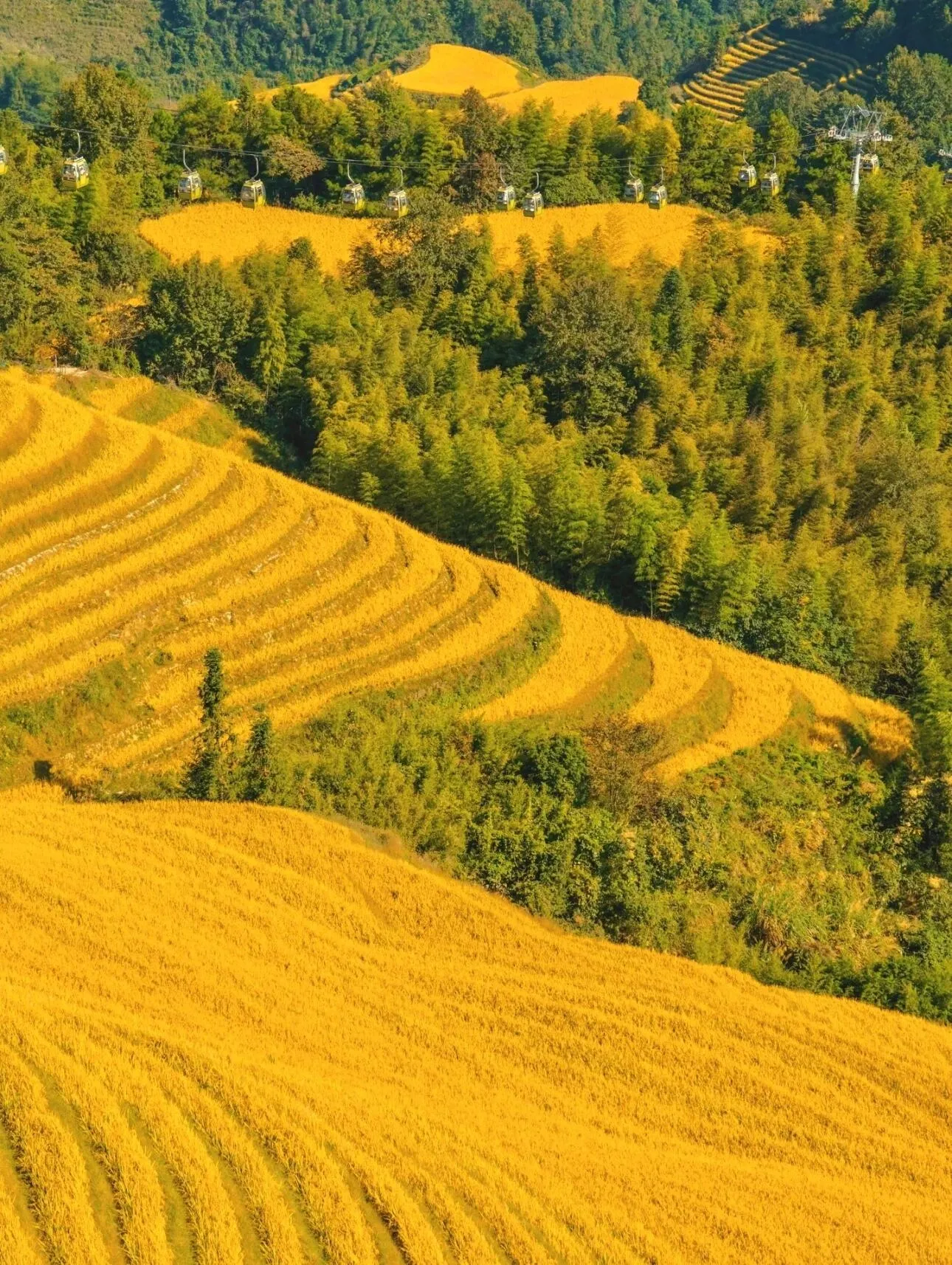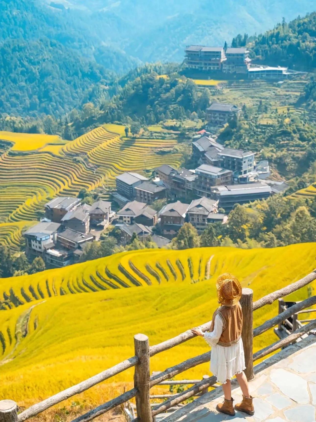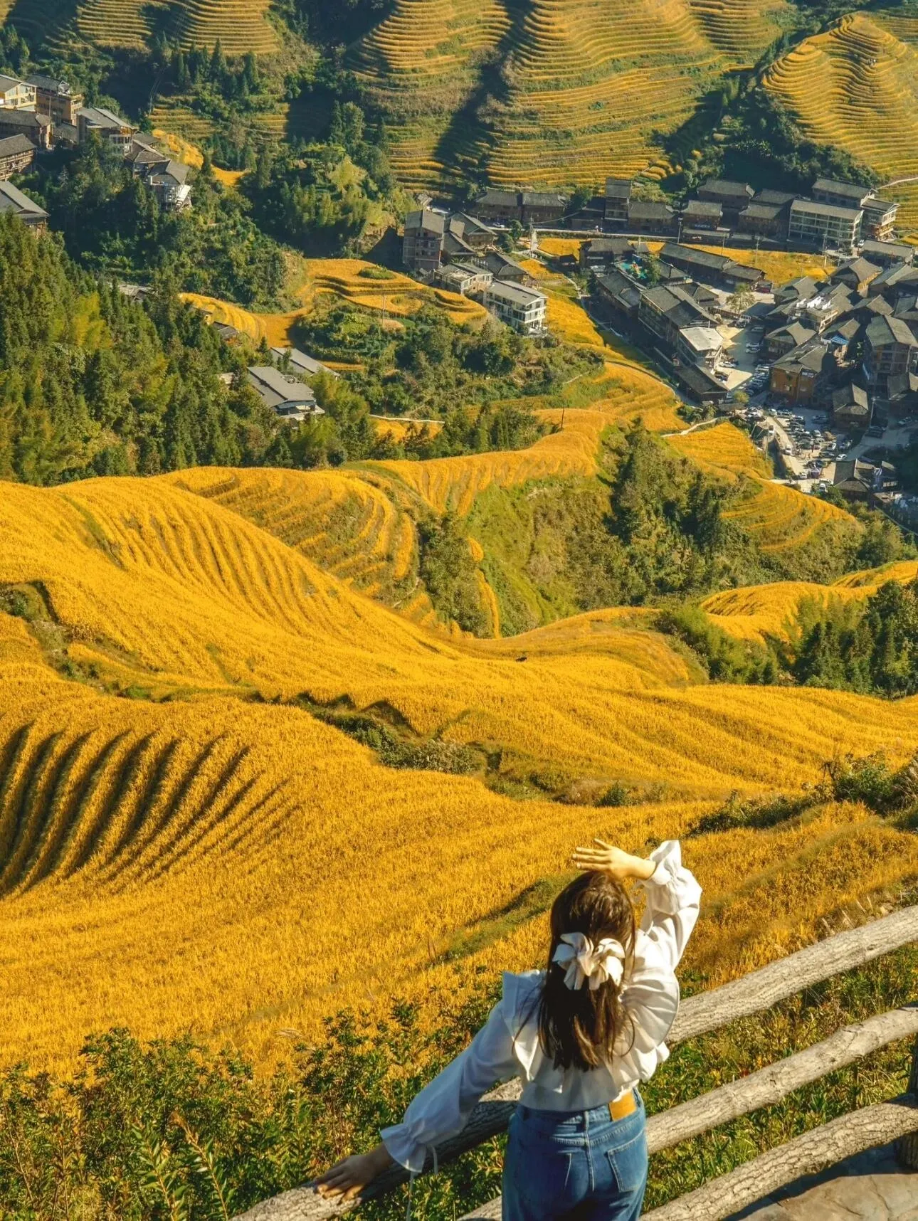 龙脊梯田 最佳观赏期为9月至10月 , 景区门票80元/人,接驳车40元/人 。游玩方式多样,可以去人少小众的寨子体验当地特色美食,登上最高观景台俯瞰“九龙五虎”和“七星伴月”等独特景观。晚上住在梯田里,第二天还能欣赏到绝美日出。在龙脊,游客可以体验一次慢生活,悠闲地漫步在金色的稻田下,感受山间的微风。