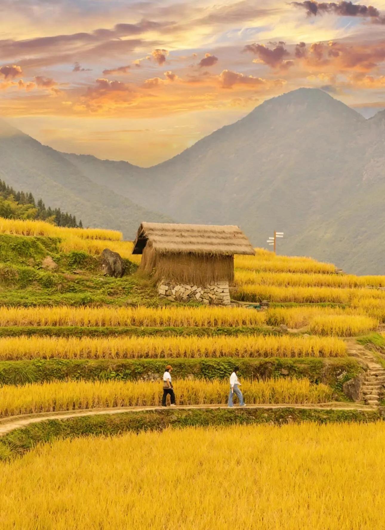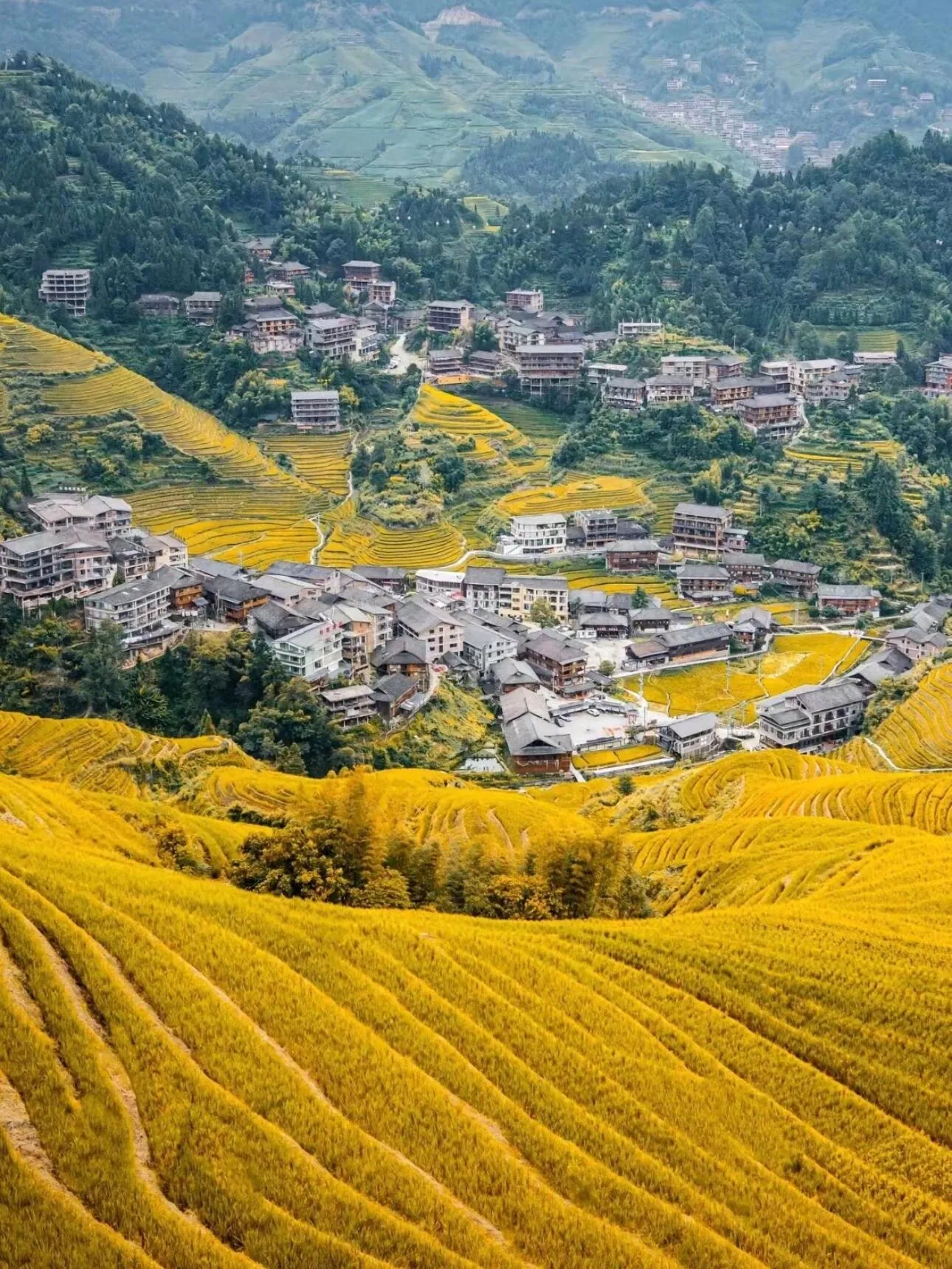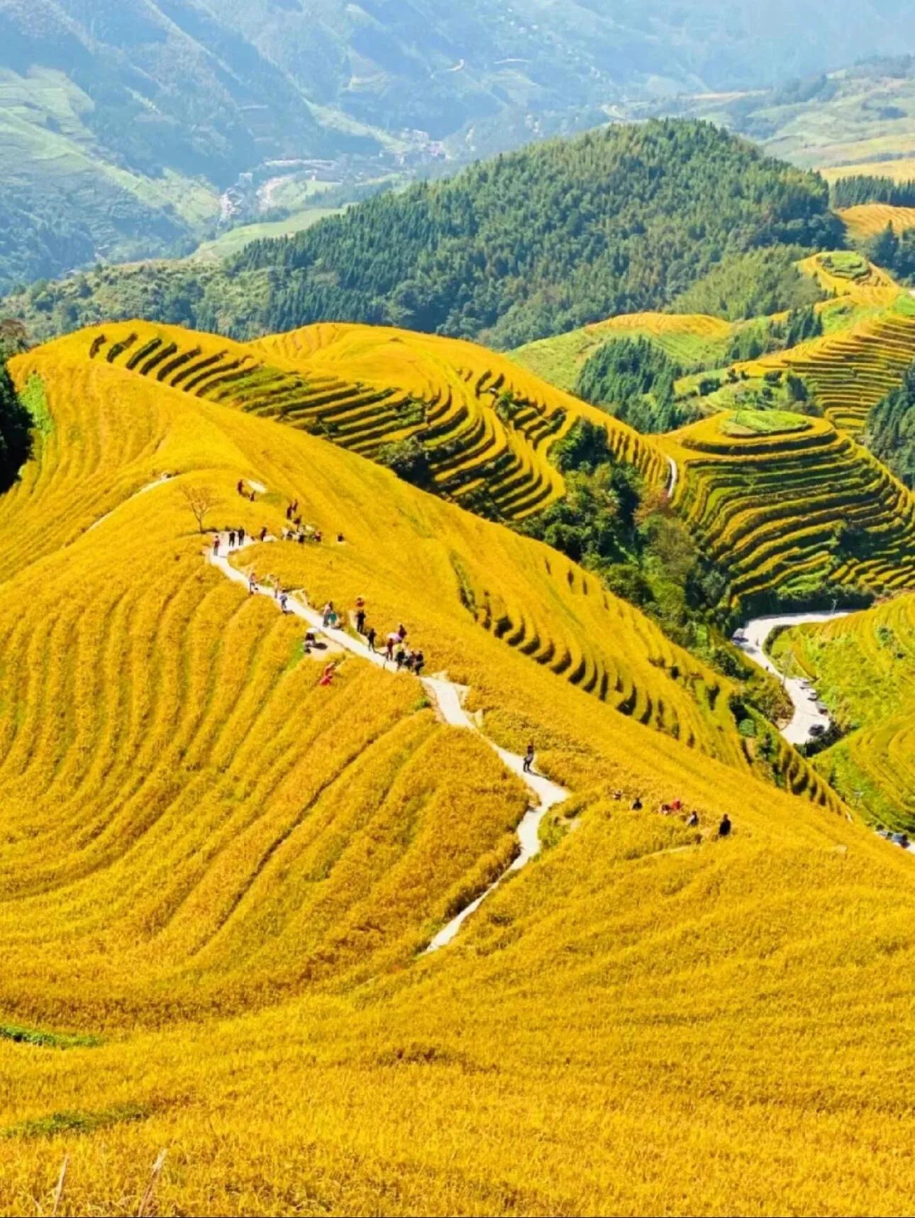 龙脊梯田 最佳观赏期为9月至10月 , 景区门票80元/人,接驳车40元/人 。游玩方式多样,可以去人少小众的寨子体验当地特色美食,登上最高观景台俯瞰“九龙五虎”和“七星伴月”等独特景观。晚上住在梯田里,第二天还能欣赏到绝美日出。在龙脊,游客可以体验一次慢生活,悠闲地漫步在金色的稻田下,感受山间的微风。