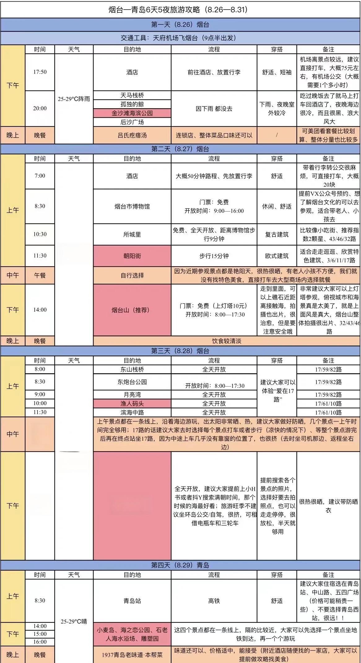 本次行程共6天5夜,适合家庭出行,包括老人和小孩。行程安排在8月底,此时烟台旅游人数适中,温度适宜,而青岛则游客较多,温度偏高。