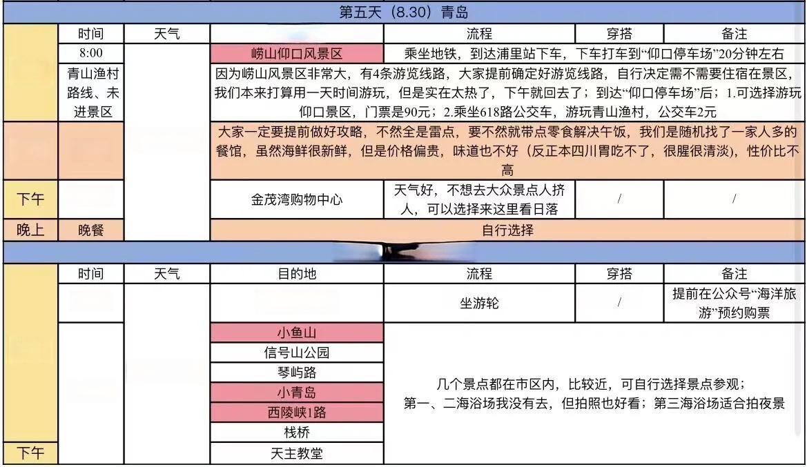 值得一游的景点有崂山仰口景区、雕塑园、金茂湾购物中心、海之恋公园、小麦岛和小鱼山公园。青岛交通便利,大多数景区附近都有地铁站。如果想品尝海鲜,建议选择当地海鲜市场购买后带去加工,因为部分海鲜餐厅价格昂贵且可能存在宰客现象。建议不要在一天内安排过多景点,多留些时间在青岛的街道和海边感受自然魅力。但需要注意的是,近期青岛天气炎热。