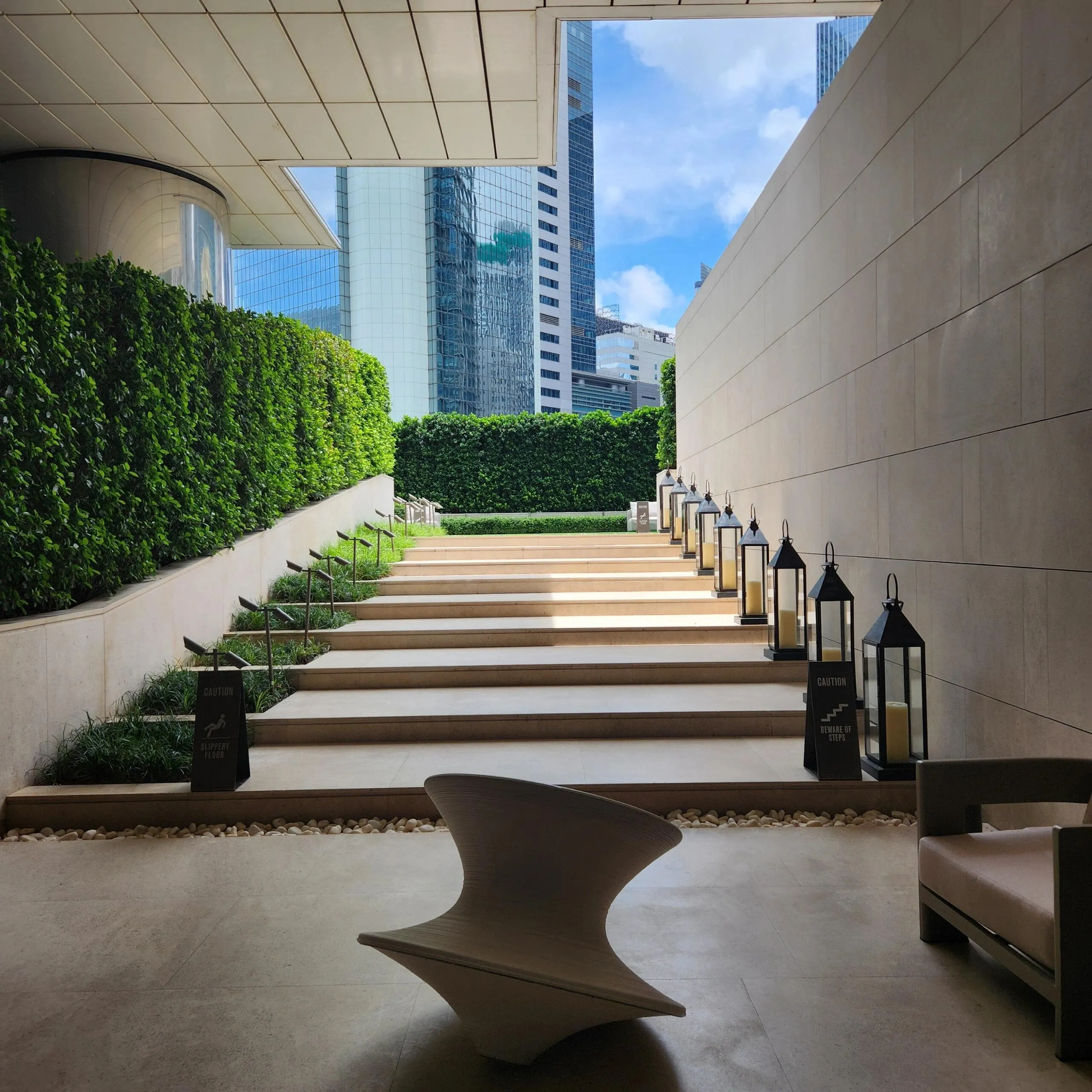 公区设施相比于奕居惊艳的客房,整体较小,但同样难以否认这是非常优秀的设计。酒店大堂设于一层,整体以灰黑色为主,空间小巧但是精致,更有居家的氛围。大堂中央用一部超长的扶梯划分开了到达与入户的空间,电梯周围非常昏暗,仿佛进入了另一个空间。酒店L层设有一个室外露台,但是为了隐私性,周围是绿植环绕的幕墙,几乎没有景观。可惜的是酒店只配有健身房,没有泳池成为了奕居的巨大短板。