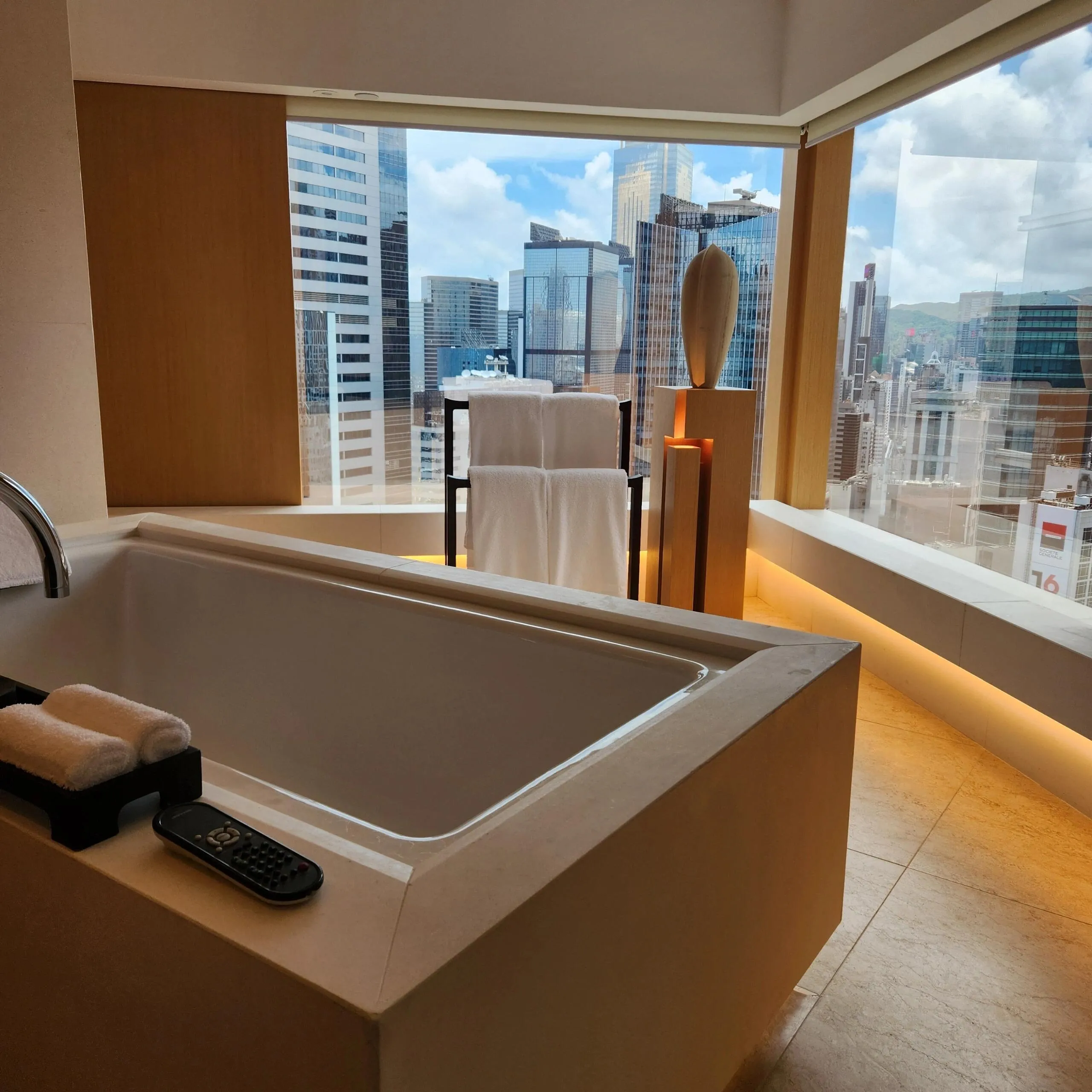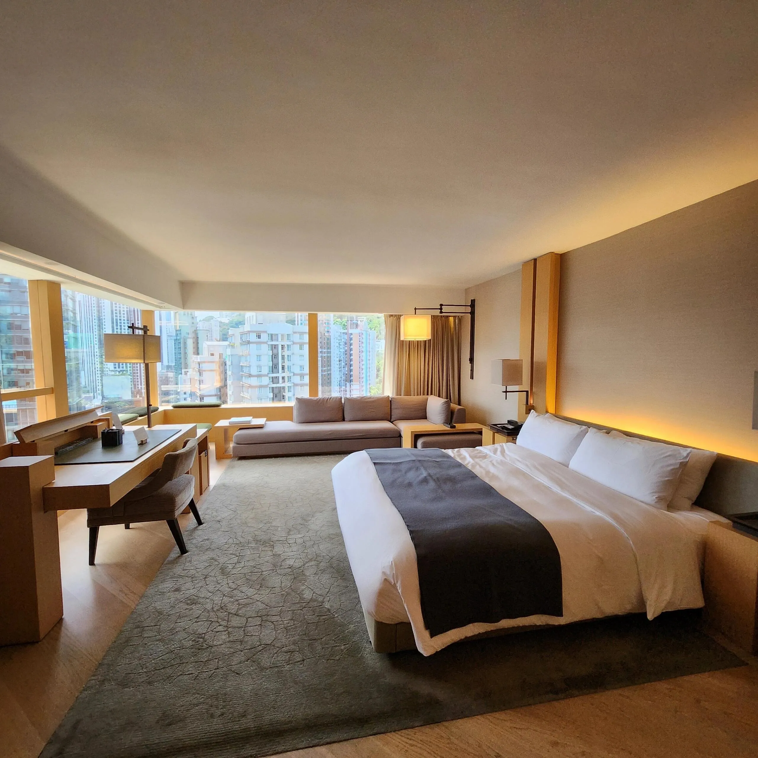 客房设施方面,傅厚民大师操刀设计的客房,历久弥新,至今仍是对于空间结构使用的典范之作。Studio 70客房面积达68m²,在世界任何一间城市酒店中都是非常优秀的。客房采用对称式布局,以入户门为分割线划分出两个空间,一侧是起居空间,另一侧则是卫浴空间以及一个巨大的步入式衣帽间,整体空间动线非常合理。浴室的设计更是点睛之笔,用两级台阶抬升整个浴室空间,搭配上半开放式的隔板,让浴室空间拥有更多的通透感。整个房间以原木风为基础,采用了极简主义的设计手法,大面积的木质元素搭配上极简风格,让整个空间非常清新,让人眼前一亮。房间内最大的特色之一就是采用了180°的大面积开窗,能够同时看到山景、城景和一隅海景,非常漂亮。