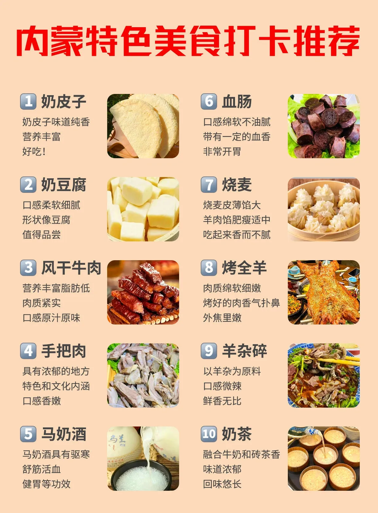 额济纳旗及周边地区有许多值得品尝的美食。烤羊腿是蒙古族的美食代表,焦香四溢,干脆不腻。焖面是呼和浩特的传统美食,深受当地人喜爱。手把肉裹上酱料后,汁水充盈口腔,香味浓郁。羊杂碎配上焙子,是地道的呼市早餐。红柳大串经过高温炭烤,红柳特有的香味与羊肉完美融合。