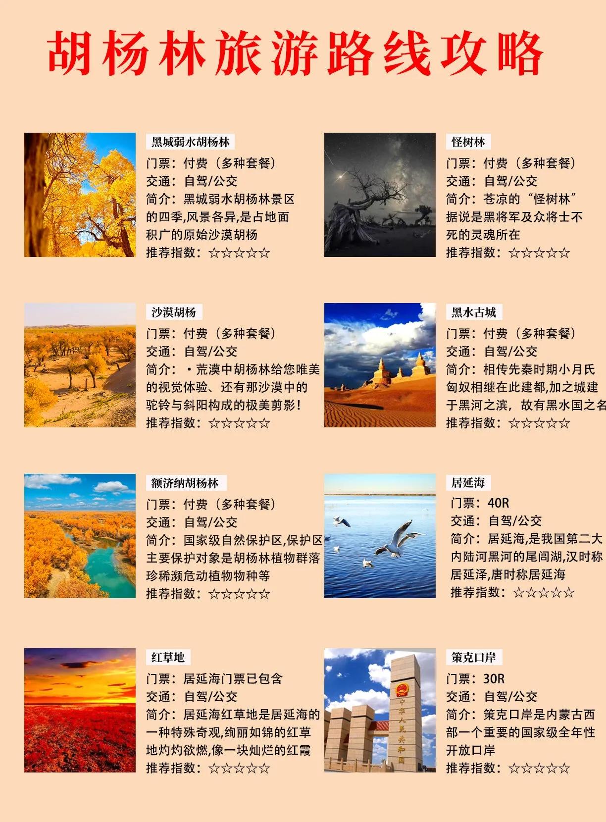 额济纳旗胡杨林是世界上仅存三大胡杨林之一,拥有39万亩胡杨树。金塔胡杨林虽然规模较小,但拥有极具特色的水上胡杨林。弱水胡杨林位于苍茫大漠中,与弱水河相映成趣。居延海是一处天然湖泊,海鸥、沙丘、芦苇荡构成壮观的日出美景。黑城弱水怪树林有一大片枯死的胡杨树,在夕阳下呈现出苍凉孤寂之美。此外,还可以在巴丹吉林沙漠体验沙漠骆驼和沙漠越野。